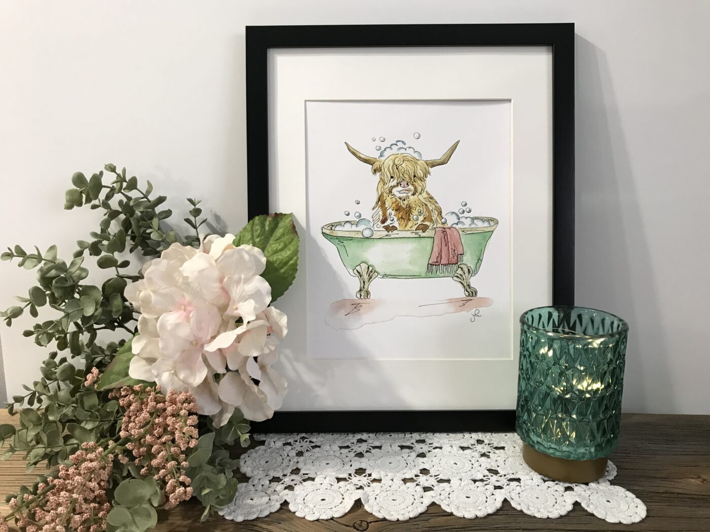My rural roots inspired me to do this farm series. The “in your face” animals bring lots of laughter and smiles.  If you or someone you know has a love for farmhouse decor or country charm, this charming chicken is the perfect addition to your home. Micron ink pen and watercolour design.