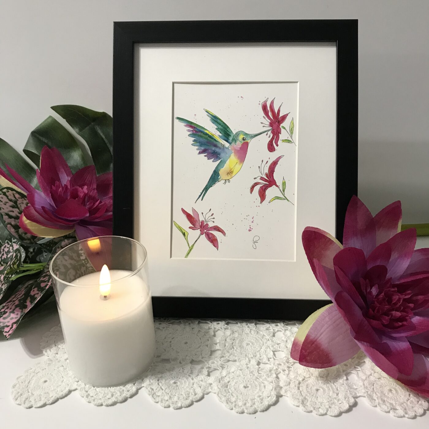 The beautiful site of a hummingbird – this piece adds a colourful touch to any room and makes a great gift for that special someone. Watercolours and ink pen.