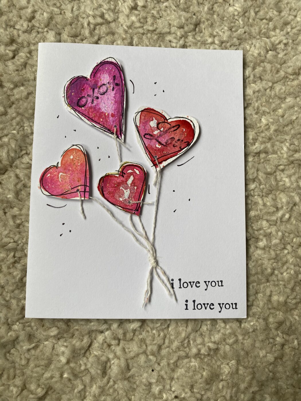 A beautiful hand made and sentimental card using a variety of media like gem stones, ribbon, stamped messages, and more. The perfect way to show that special someone how much they are loved. The outside message: “I Love You.” A bright and colourful design that is sure to bring a smile to someone’s face. Blank inside so you can customize your own sentiment. Includes an envelope.