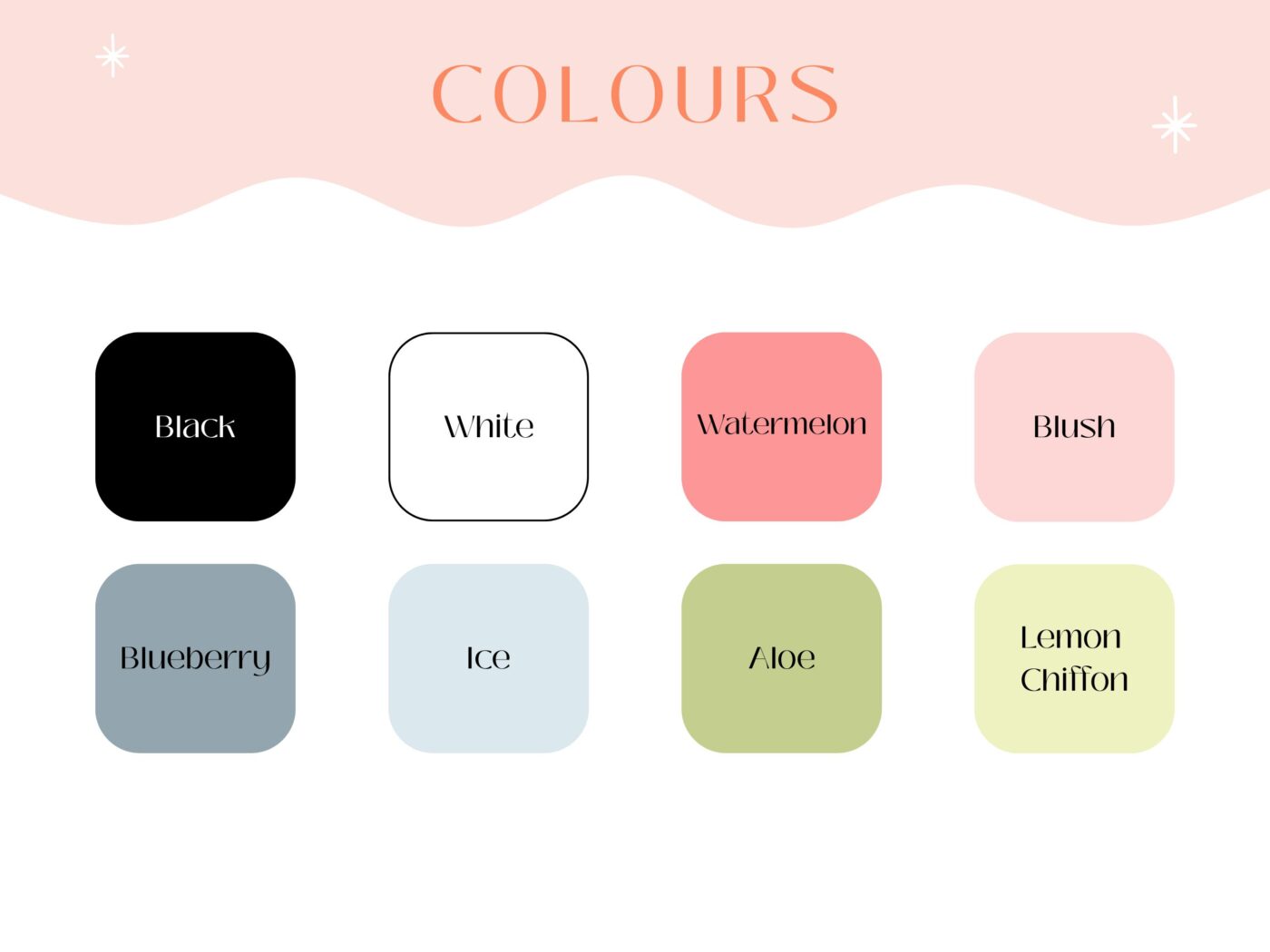 Colour options for name: Black, White, Blush, Blueberry, Ice, Aloe, Lemon Chiffon