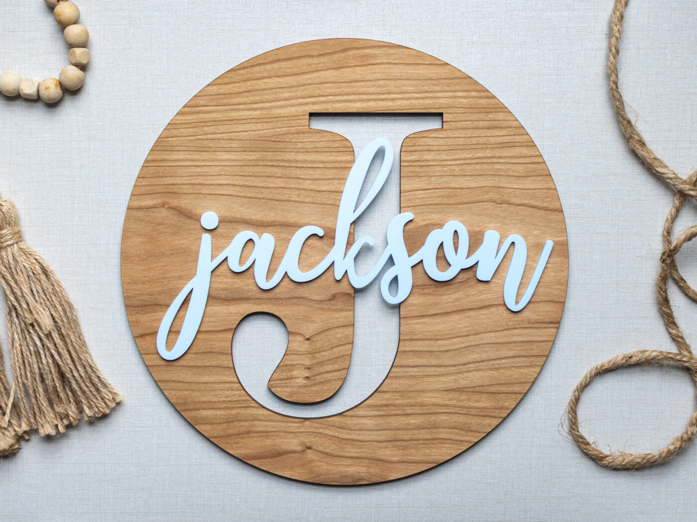 This custom name sign is the perfect addition to any home, office, or as a thoughtful wedding gift. These personalized wood name signs feature a beautiful round backing made of Cherry plywood, with your initial cut out and your name featured in quality coloured acrylic.