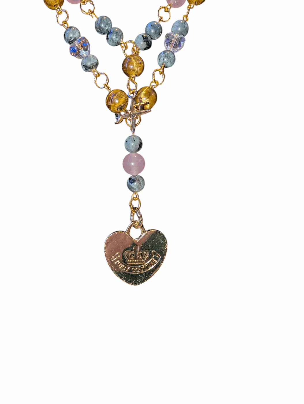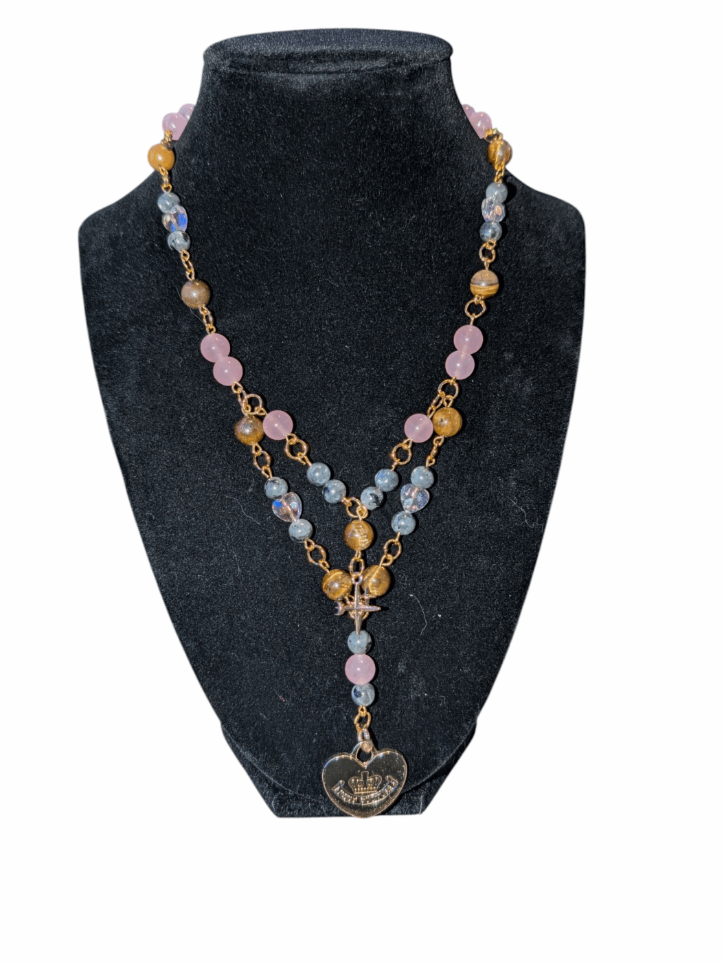 A reclaimed Juicy Couture charm takes center stage, transformed into something uniquely enchanting. It’s surrounded by a rich mix of Larvikite, Tiger’s Eye, Malaysia Jade, and sparkling Swarovski crystals, each bead adding its own depth, shimmer, and personality. Bold, chic, and one-of-a-kind, this piece blends thrifted luxury with natural stones for a look that’s both modern and magical.