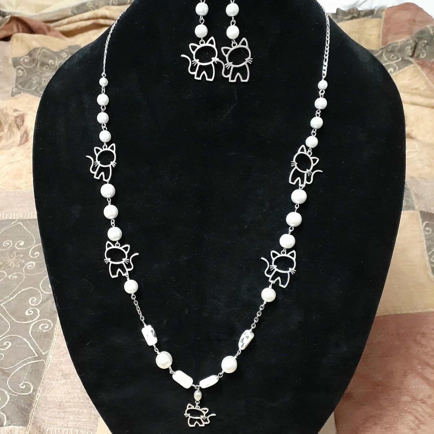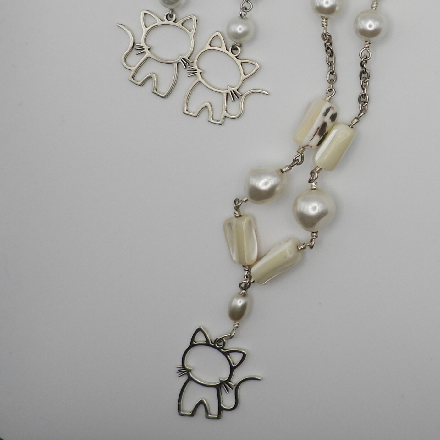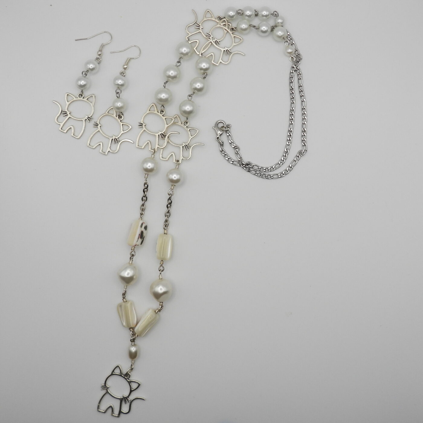Kitten charm necklace with pearls and mother of pearl beads, on a wonderful full length necklace. Show off your unique fashion statement with these cute lil cat charms. Purrfect little kitty cats on the necklace and matching earrings.