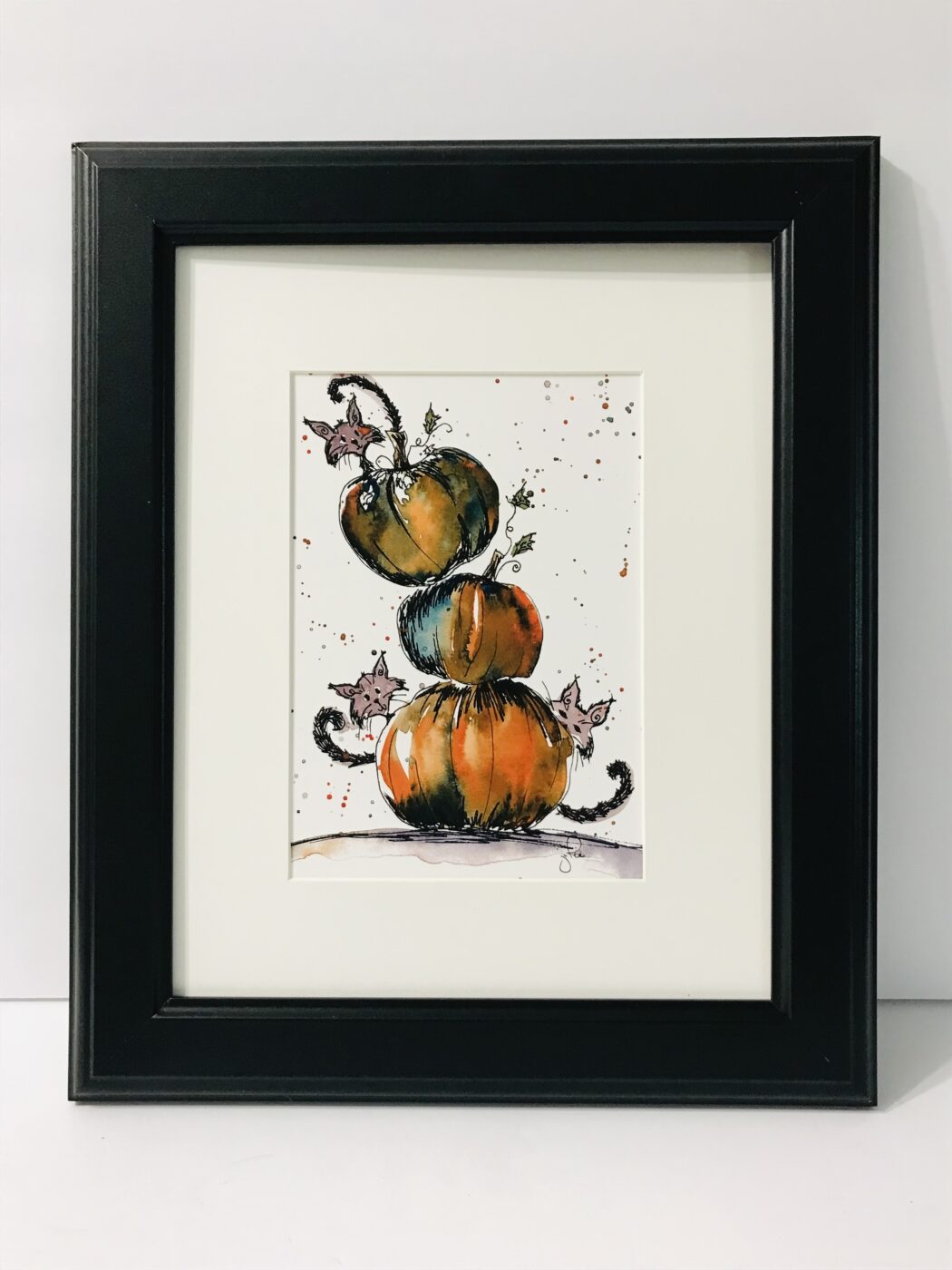 Part of my Halloween Collection. This piece captures Halloween in the cutest way with a stack of pumpkins and 3 mysterious cats peeking out from behind them. A perfect mix of cute, spooky, and fun, all in one. Micron ink pen and watercolour design.