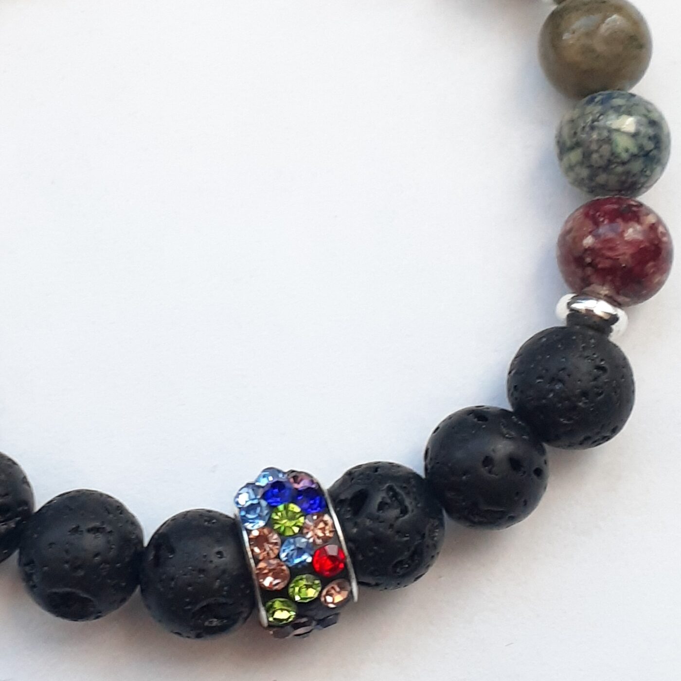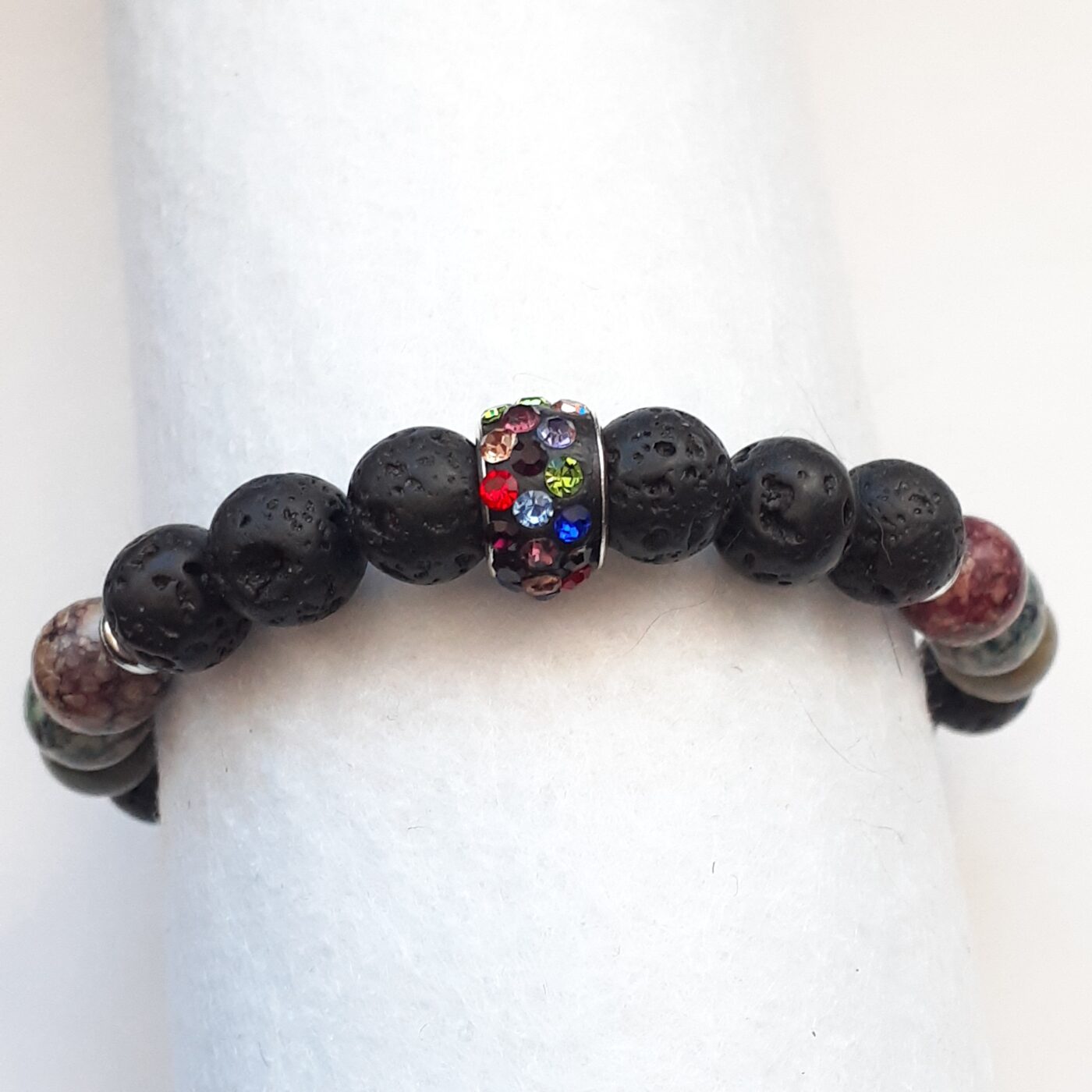 This lava bead stretch bracelet sports a “Bling Bling” colourful rhinestone-encrusted metal focal bead, and colourful stone beads. It combines natural porous volcanic rock with high-shine glamour. It is a fashion accessory and a personal essential oil diffuser. Simply apply a drop or two of your favourite essential oils or perfume onto the porous lava beads. Make certain the oil used is safe on your skin. Lava bead bracelets are popular for the modern look, and blends raw textures with sparkling, eye-catching elements. Lava stone is known for it’s grounding and calming properties; the energy of mother earth’s core and volcanoes. Wearing a lava rock bracelet is earthy, promotes feelings of stability emotional balance, security, and peace.