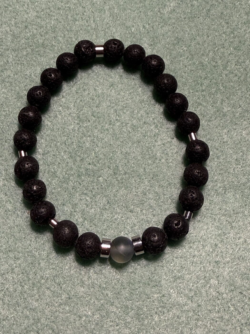 Lava stone, stainless steel and iridescent blue glass bead bracelet.