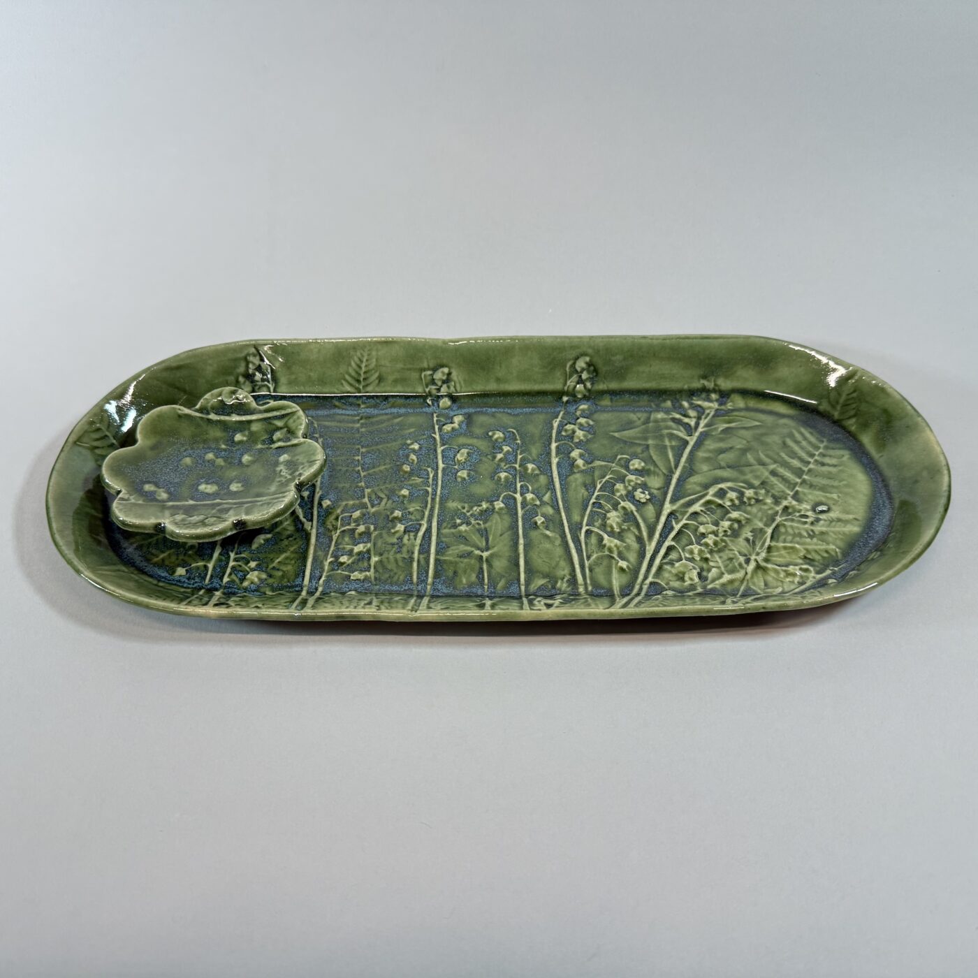 Entertain with this one-of-a-kind, hand made tray that has been embossed with real lily of the valley flowers from my garden. It comes with a small matching dish for condiments.