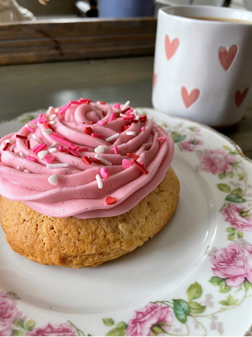 Soft, cake-like sugar cookie decorated with buttercream icing and Valentine sprinkles.