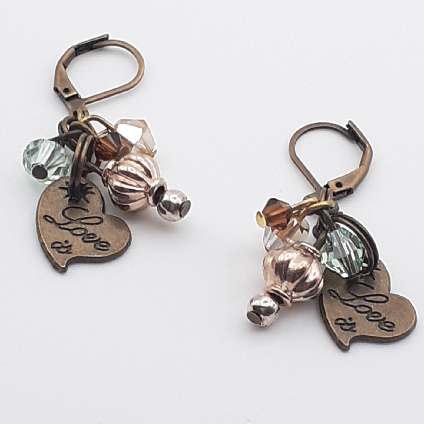 Bronze heart charms with the word Love inscribed on it make up these darling little earrings with the addition of sparkling swarovski crystals for a ton of shine. The earrings are on bronze lever back earrings. They measure just over 1 inch.