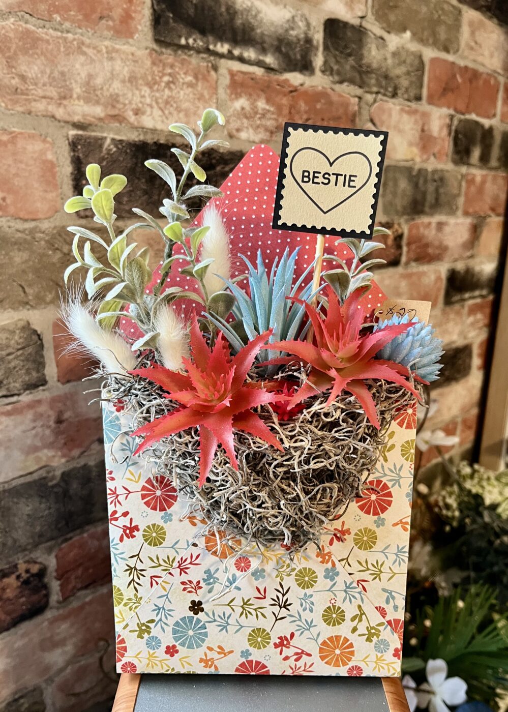The idea for the Love Letter Collection grew from my love of old letters, pretty paper, and fun floral designs. Each unique envelope “pocket” is made from premium paper and filled with a rich variety of faux floral and greenery, which keeps their message of love long-lasting. Perfect for a breath of fresh décor or as a thoughtful, one-of-a-kind gift for Valentine’s Day, birthdays, or simply thinking of you.The Love Letter arrangement has an integrated stand allowing it to sit upright on a desk, shelf, table or window ledge.