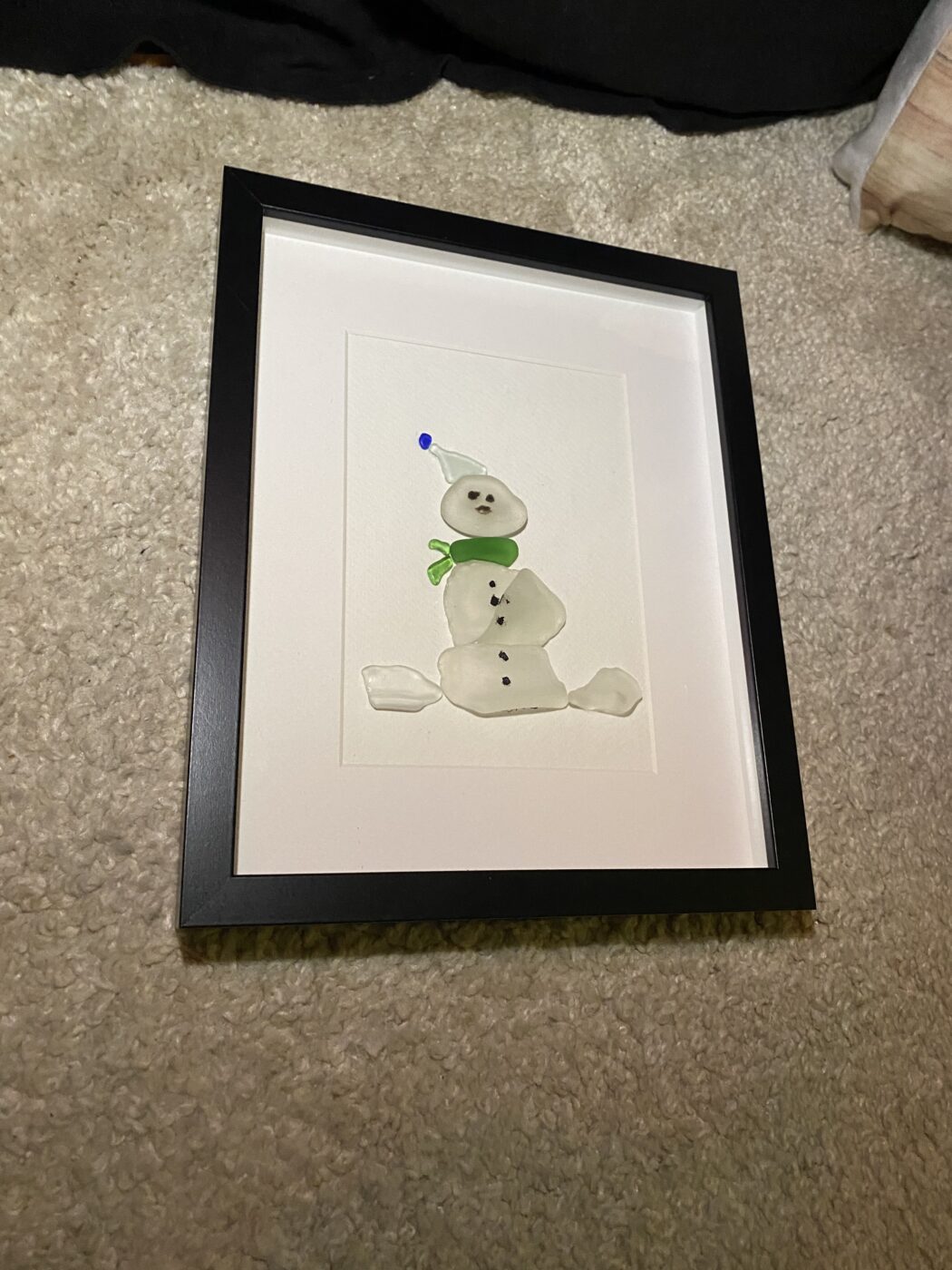 This festive piece is made from seaglass found along Lake Erie. The shape of the seaglass replicates a melting snowman so perfectly. Finished in an 8″ x 10″ black frame that can be displayed on a wall or tabletop. Makes a beautiful gift.