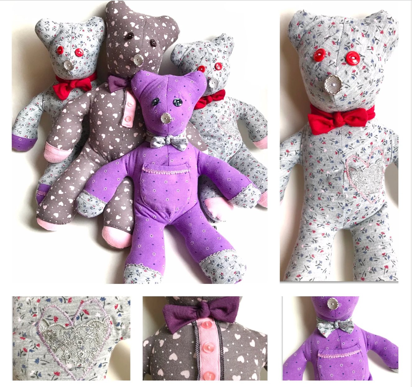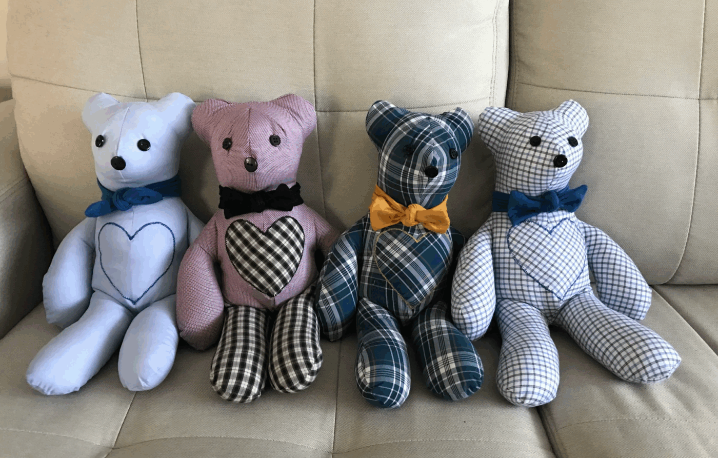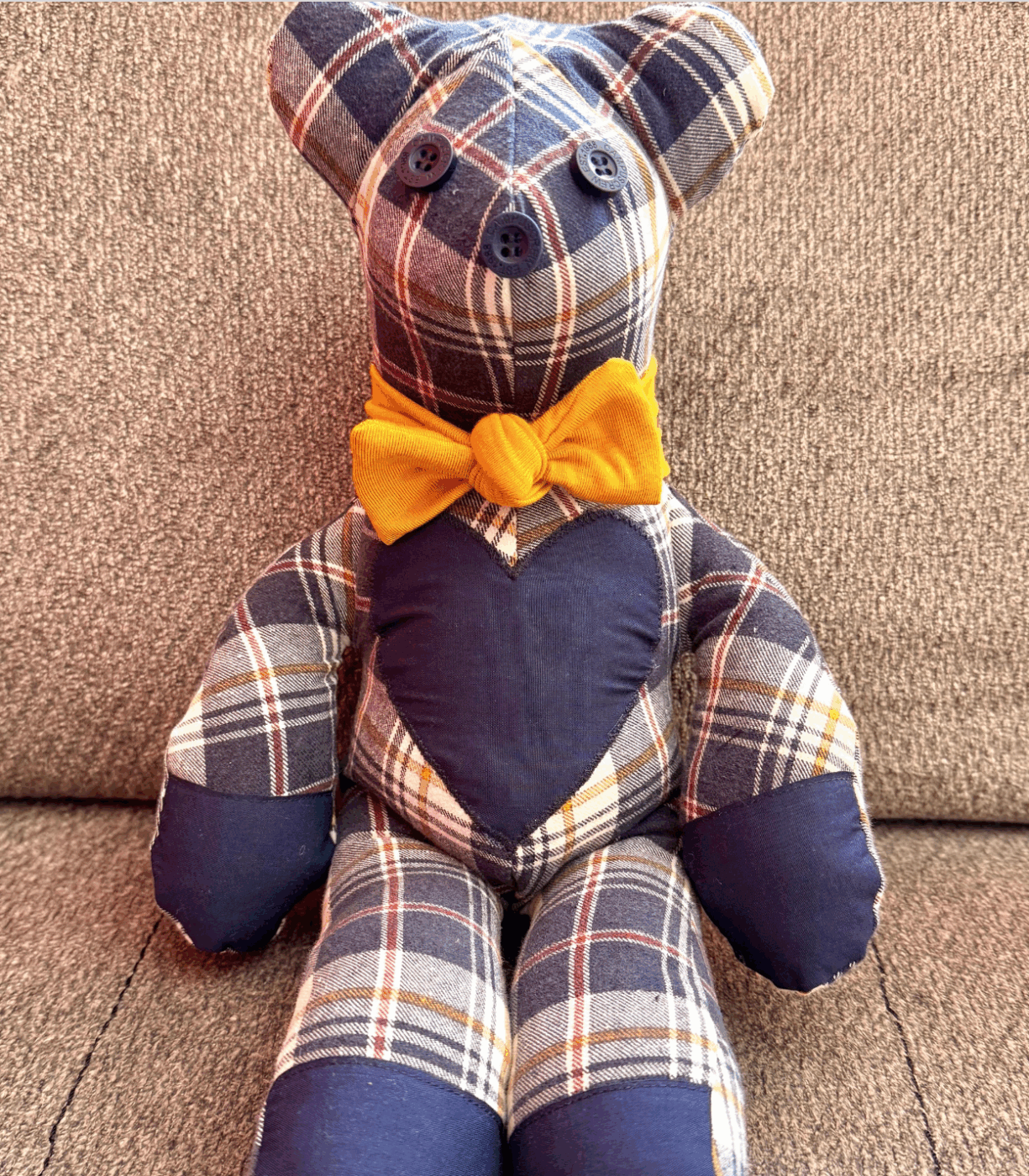 These special bears are made from a shirt, sweater or special piece of clothing that you provide (I try to keep details from the piece of clothing and add it to the design of the teddy bear making).