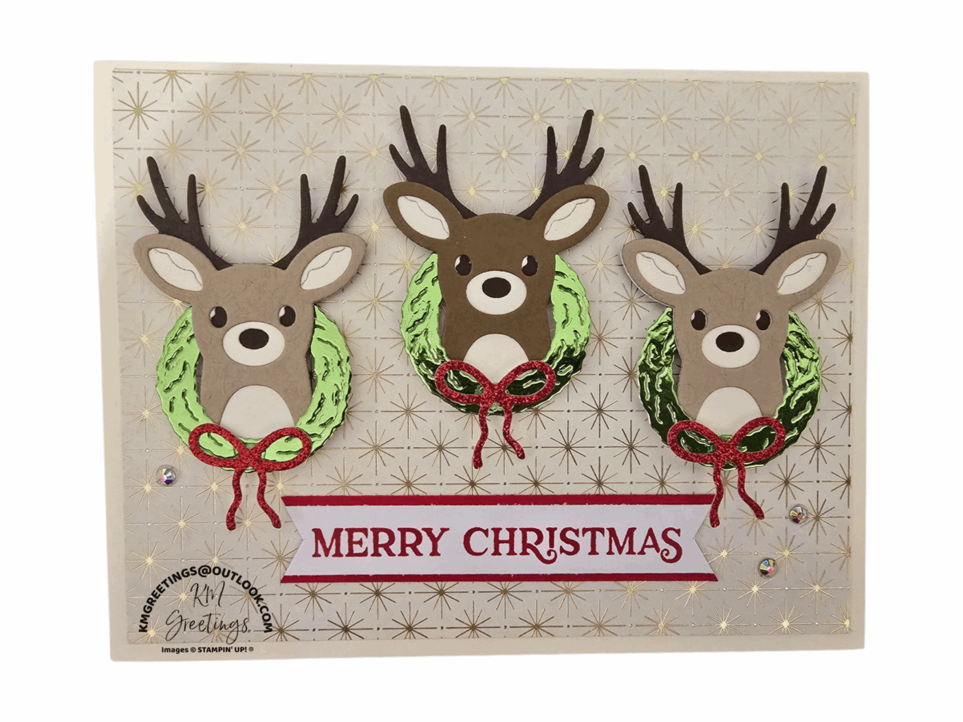 This handmade greeting card is the cutest way to send your Christmas greeting to that special someone. Featuring 3 adorable deer within a wreath, on a festive background. This card does not have a message inside allowing you to customize your message. A perfect greeting card for the holiday season. Small embellishments add to the beauty of this card.