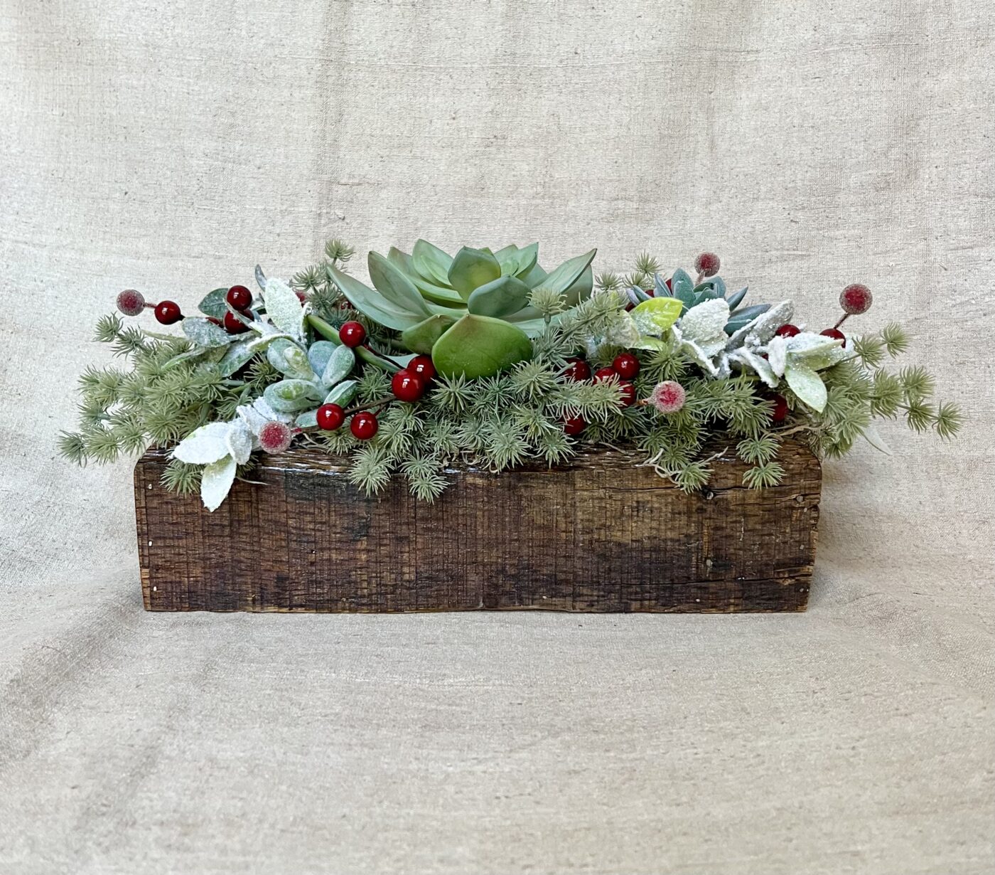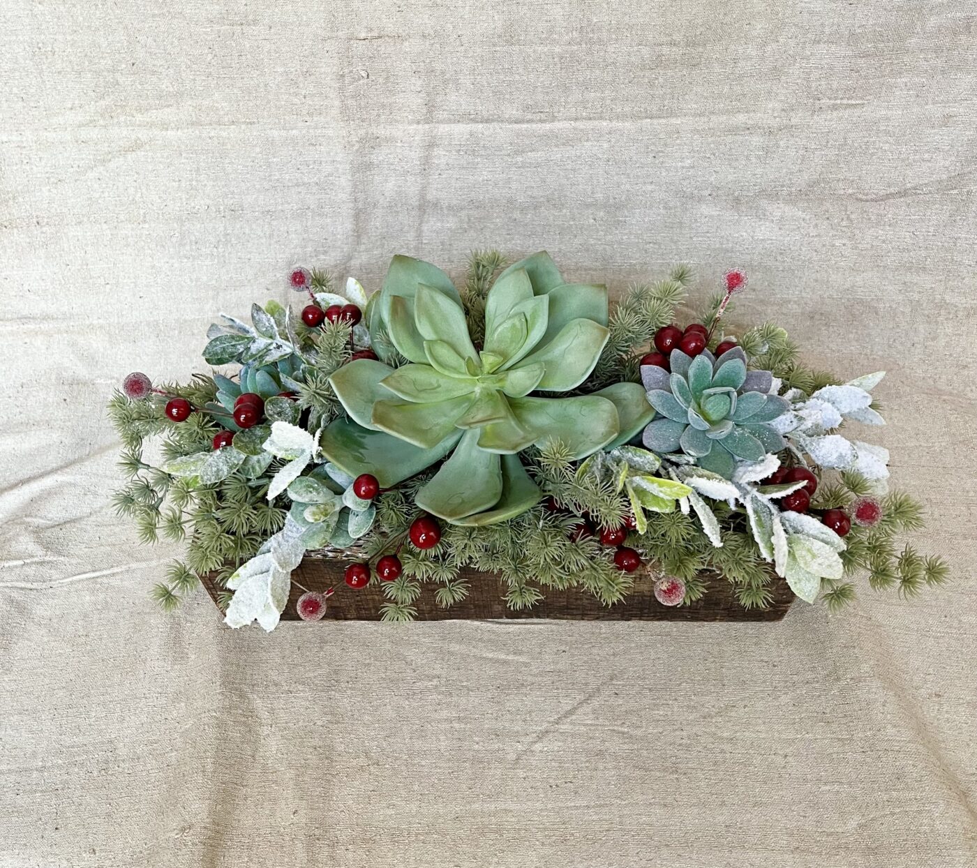 The large centre succulent is quite the show-stopper in this mini-garden. Arranged in a locally hand-made rustic wood box, this design features premium faux plants with some festive sparkly touches. A centrepiece to enjoy the whole winter season.