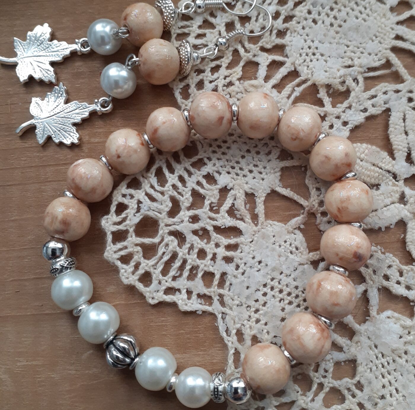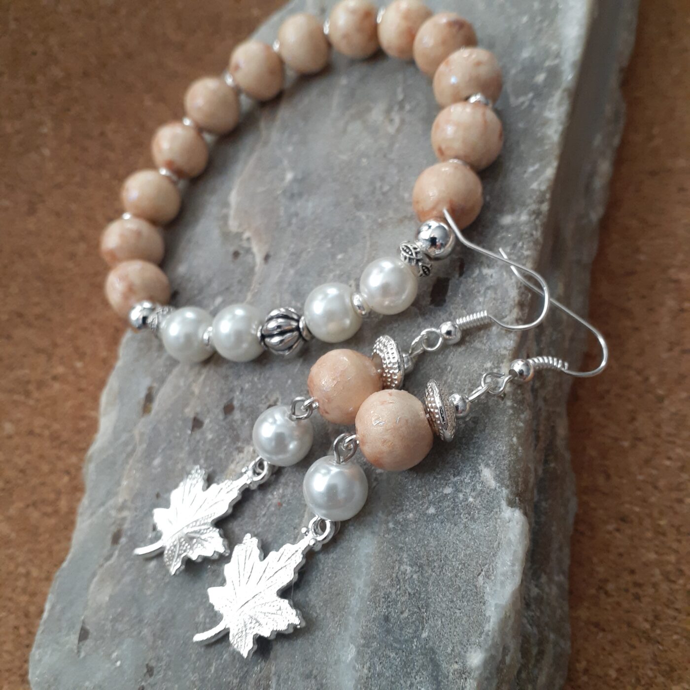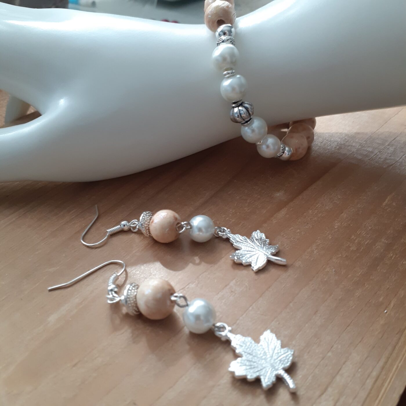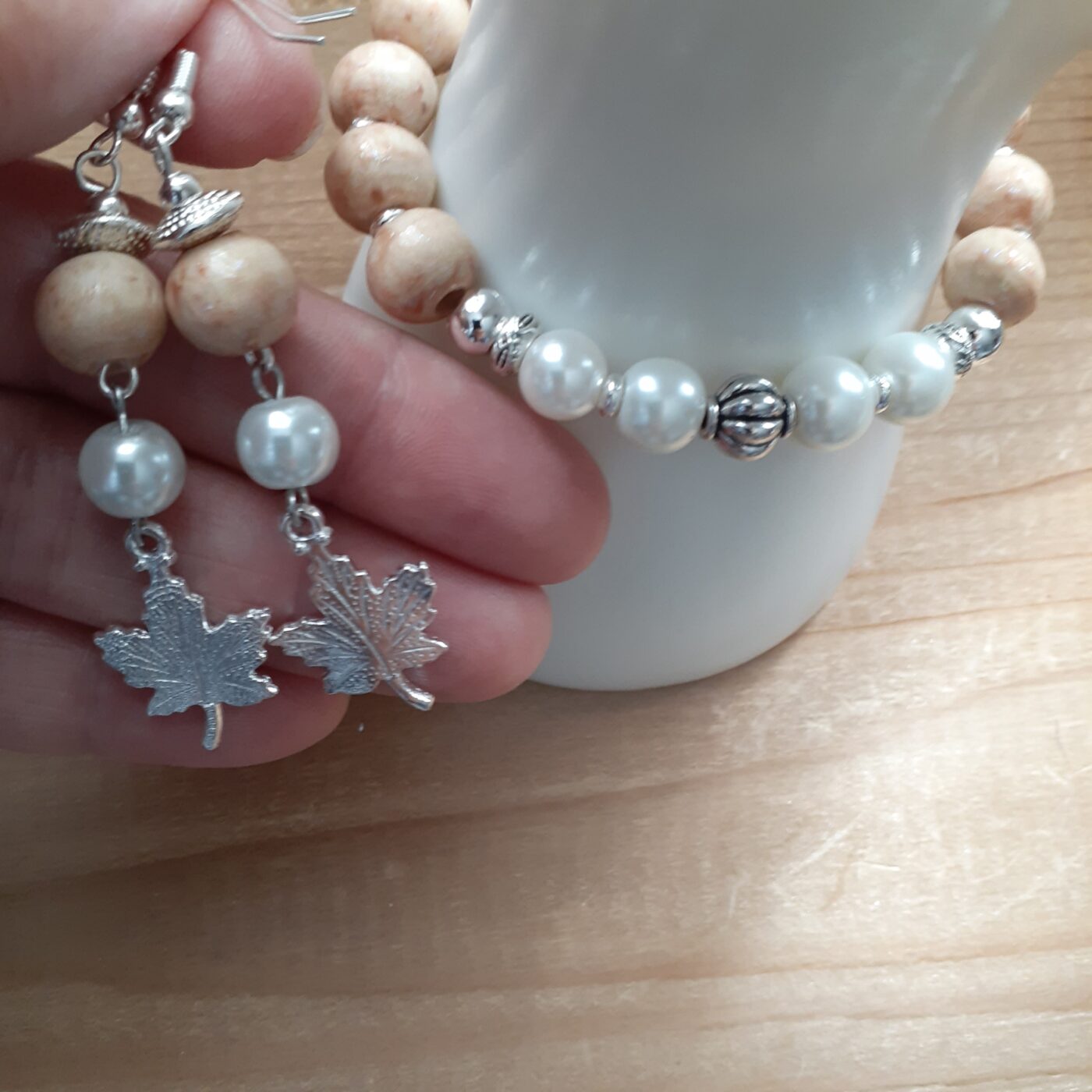 Natural colour wood beads and faux white pearls create these delightful dangle earrings and bracelet set. Perfect for any season to wear proudly with the maple leaf charms. Stretch-style bracelet for easy wear, made with light weight beads. A very classy design.