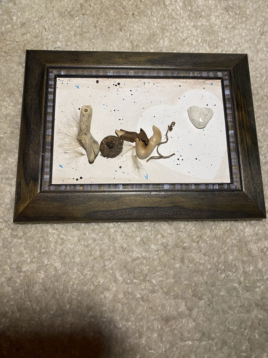This unique piece uses materials, rock, and seaglass from Lake Erie to spell the word LOVE on a watercolour background. A beautiful statement piece to light up any room. Finished in a 6″ x 8″ refurbished frame.