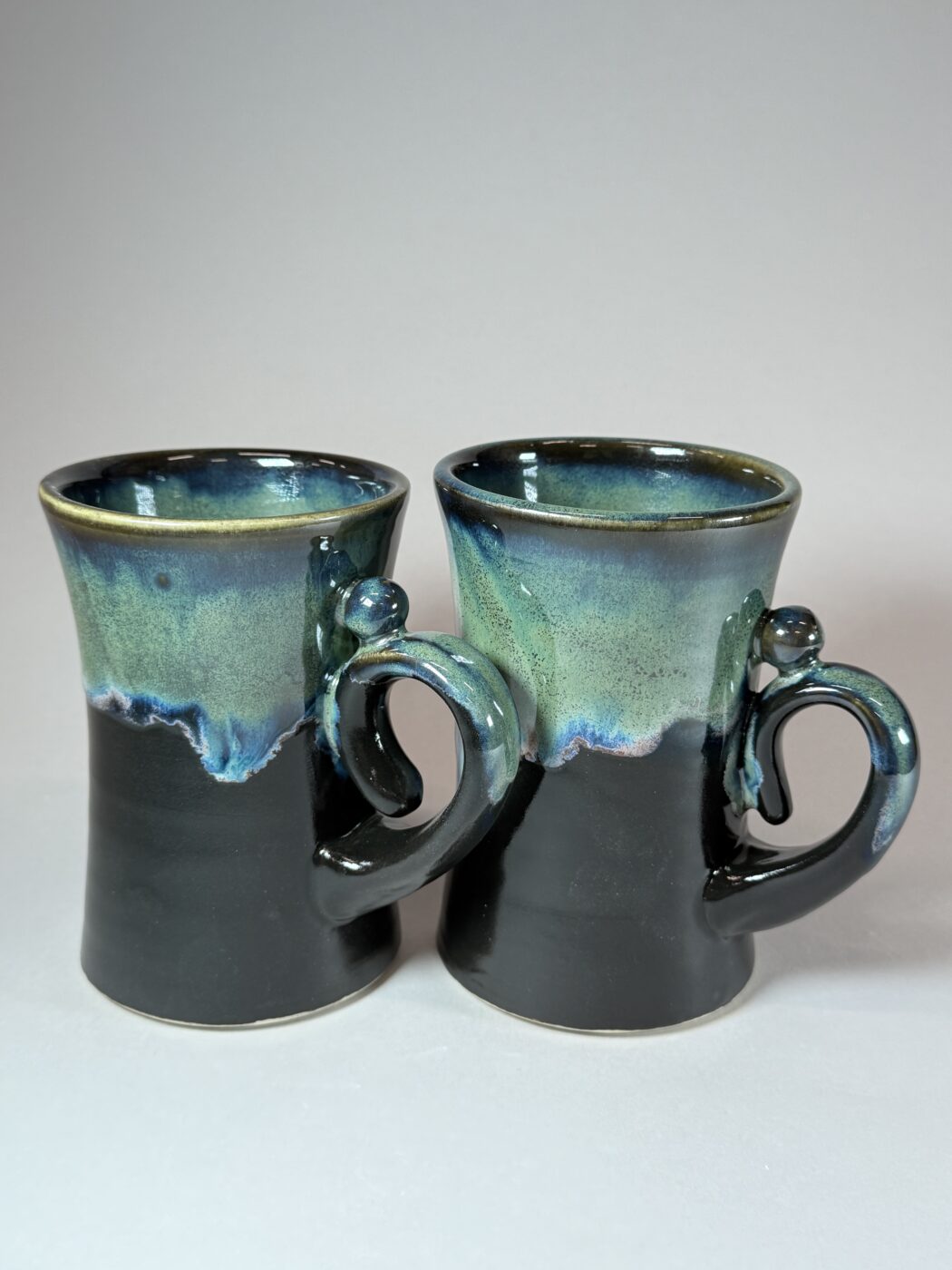 These two handmade stoneware mugs capture the dramatic northern night sky, where darkness feels deep and alive. The glaze begins with an inky black base—rich, velvety, and expansive—like the vast stillness of midnight in the Canadian wilderness. Across that dark canvas, a vivid wave of green and blue flows and shimmers, echoing the movement of the aurora borealis as it dances across the horizon.