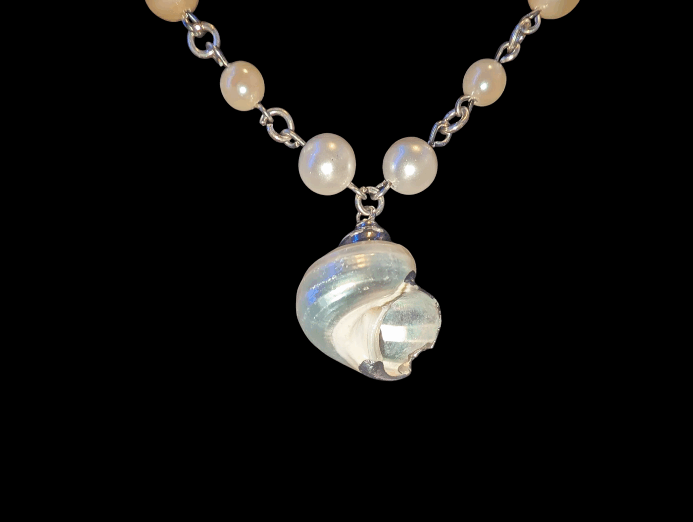Ocean radiance features a Shell pendant with various shades of pearls. This piece will bring the ocean with you, no matter where you go. Made in Silver.