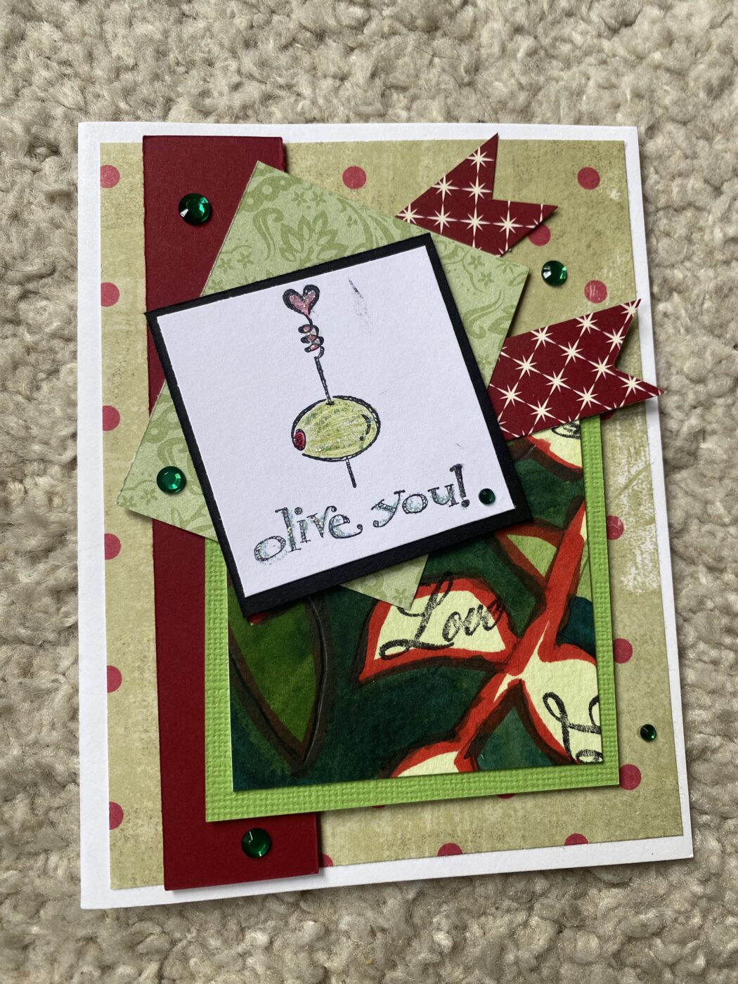 A beautiful hand made and sentimental card using a variety of media like gem stones, ribbon, stamped messages, and more. The perfect way to show that special someone how much they are loved (especially the olive lover). The outside message: “Olive You.” A bright and colourful design that is sure to bring a smile to someone’s face. Blank inside so you can customize your own sentiment. Includes an envelope.