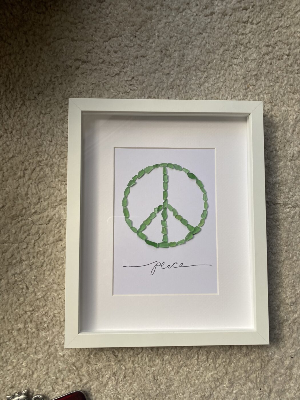 Such a simple but powerful piece. The beautiful green seaglass is from Lake Erie. Finished with the scripted word “Peace”. Simple, elegant, charming – the perfect addition to any room.