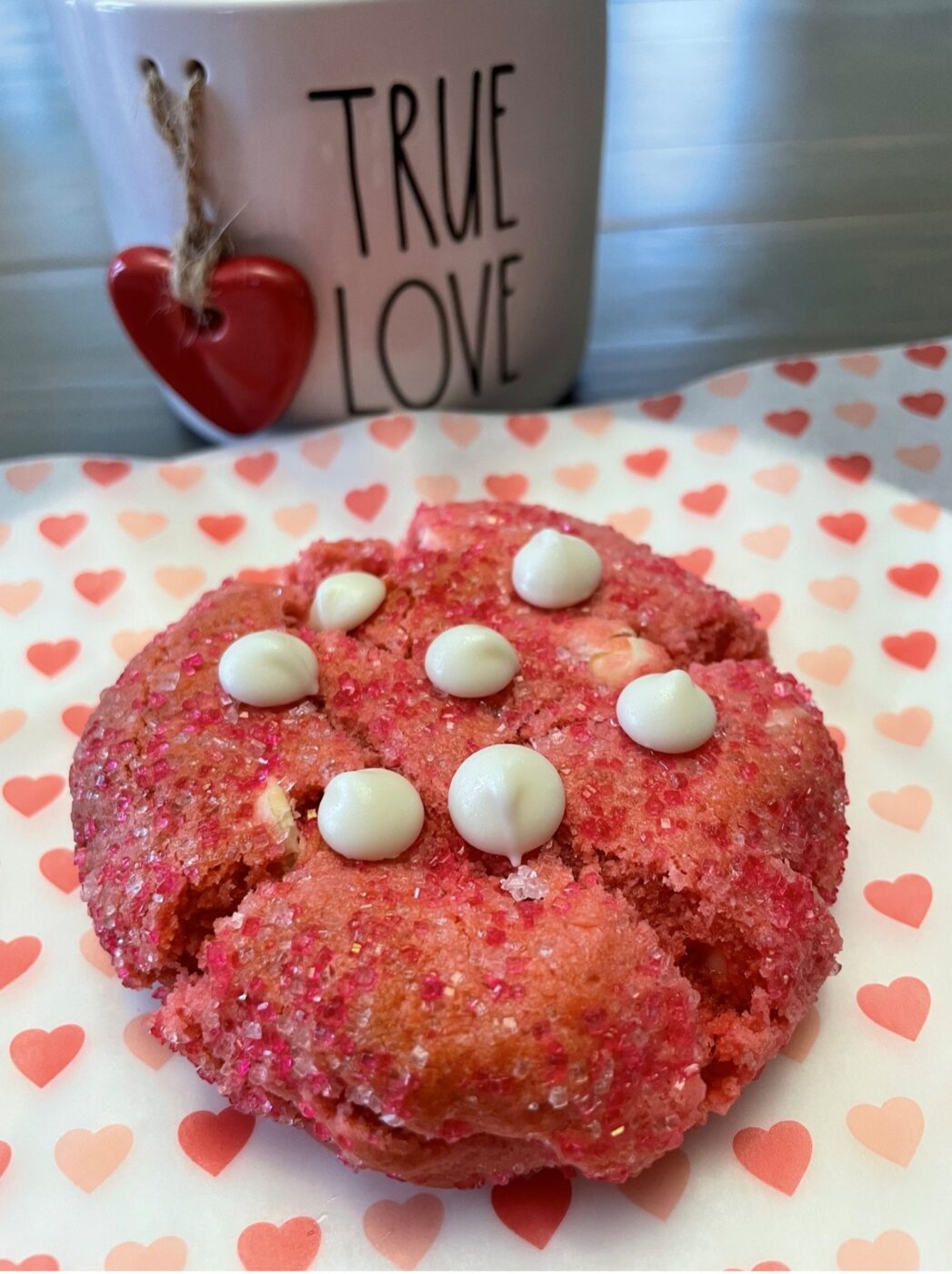 Rolled in pink sanding sugar for a crunchy outside and soft centre, loaded with white chocolate chips.
