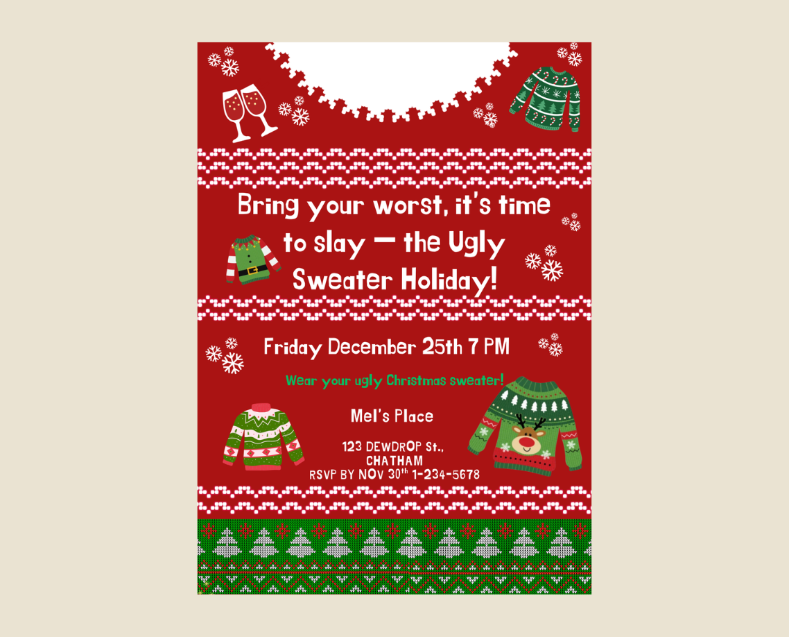Get ready to party with this “Red, Green, It’s Time to Slay That Ugly Christmas Sweater” Invitation, printed on high-quality card stock. Perfect for inviting friends and family to a festive, fun-filled ugly sweater celebration!