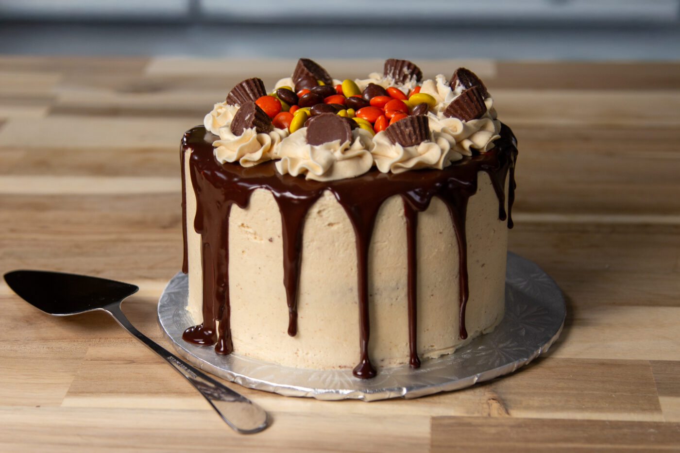 Chocolate cake with peanut butter frosting. Topped with chocolate drip, reese’s peanut butter cups and reese’s pieces.