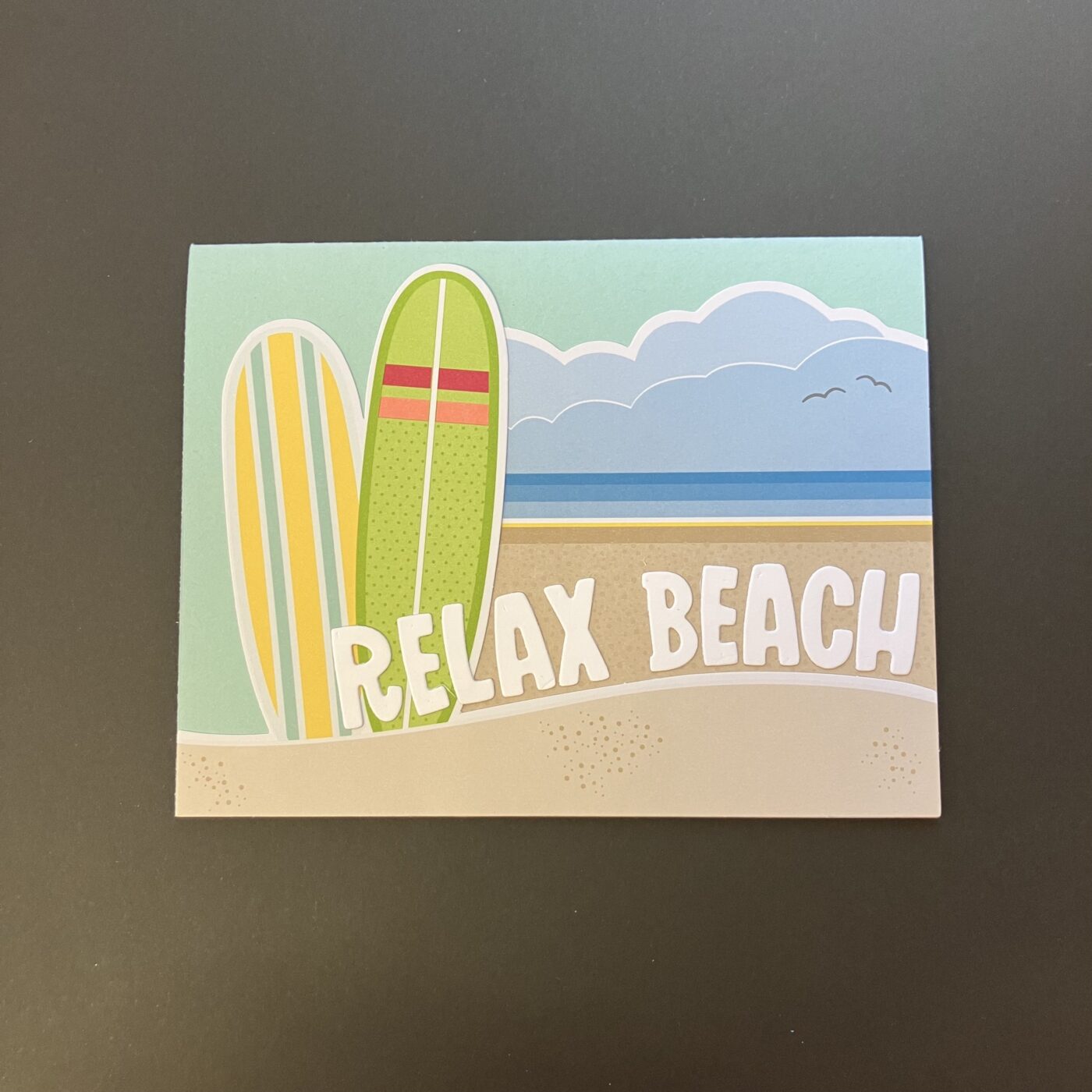 Landscape orientation, white cut out text, surfboards in sand, island in background, light blue card.