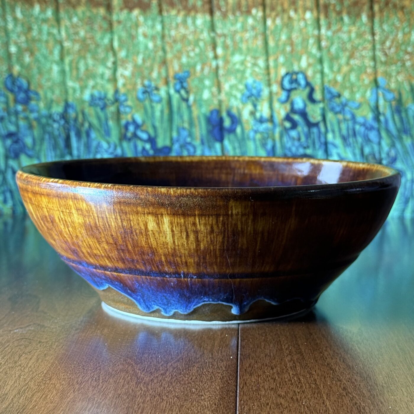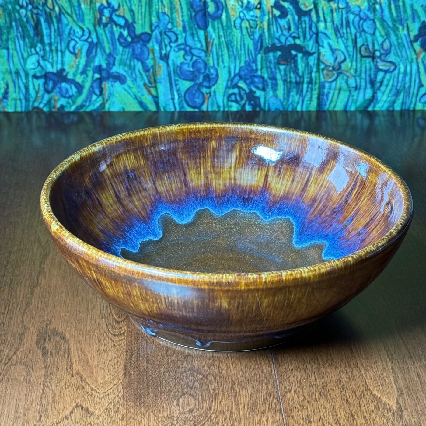 This wheel thrown bowl has been glazed to emulate a running water fall. The outside also includes a beautiful blue drip falling from a translucent iron brown flow.