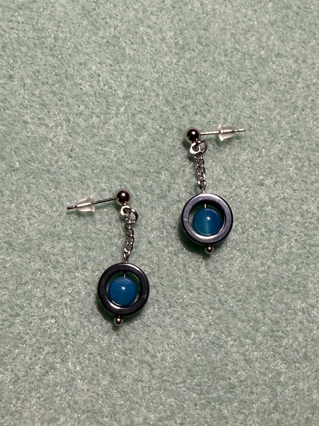 Earrings made of stainless steel, hematite rings, and semi precious stones.