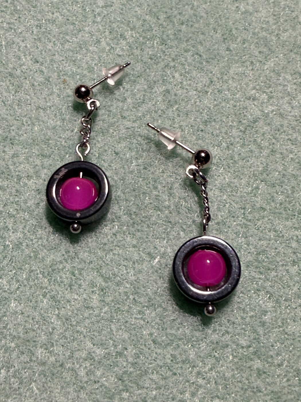 Earrings made of stainless steel, hematite rings, and semi precious stones.