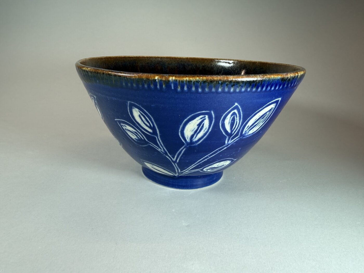This handmade stoneware bowl is anything but quiet—it’s a statement piece that brings energy and artistry to the everyday. The exterior is coated in a rich, saturated royal blue, hand-painted to create a bold, confident backdrop. Carved through that surface, graphic sgraffito leaves emerge with striking contrast, giving the piece texture, movement, and a distinctly modern edge.