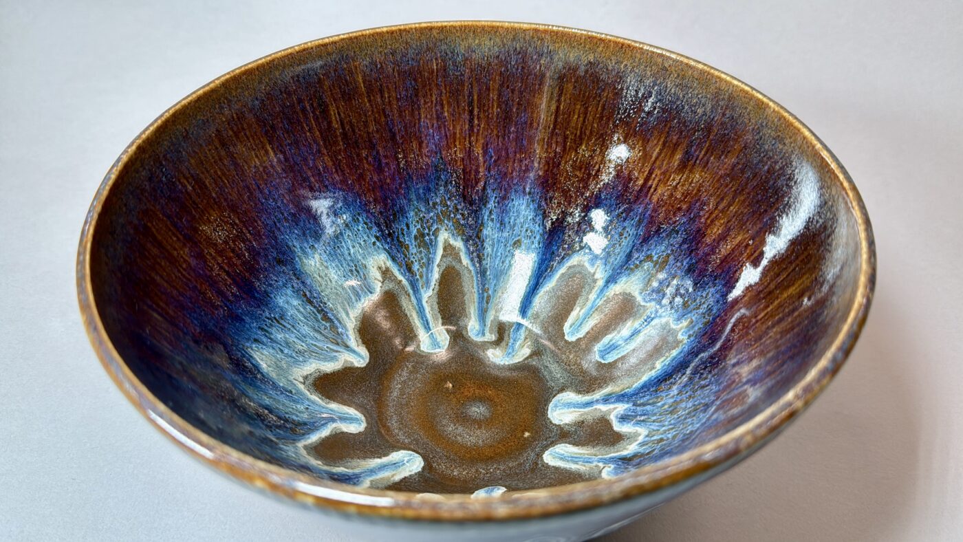 Inside, the drama continues. A flowing cascade of variegated browns melts seamlessly into vivid royal blue, finishing in soft, pale blue edges that catch the light beautifully. The effect is almost wave-like—organic, fluid, and impossible to replicate exactly, making this bowl truly one of a kind.