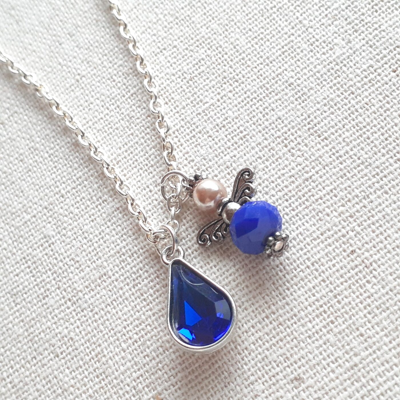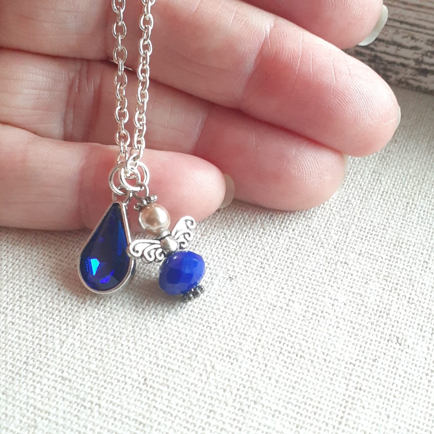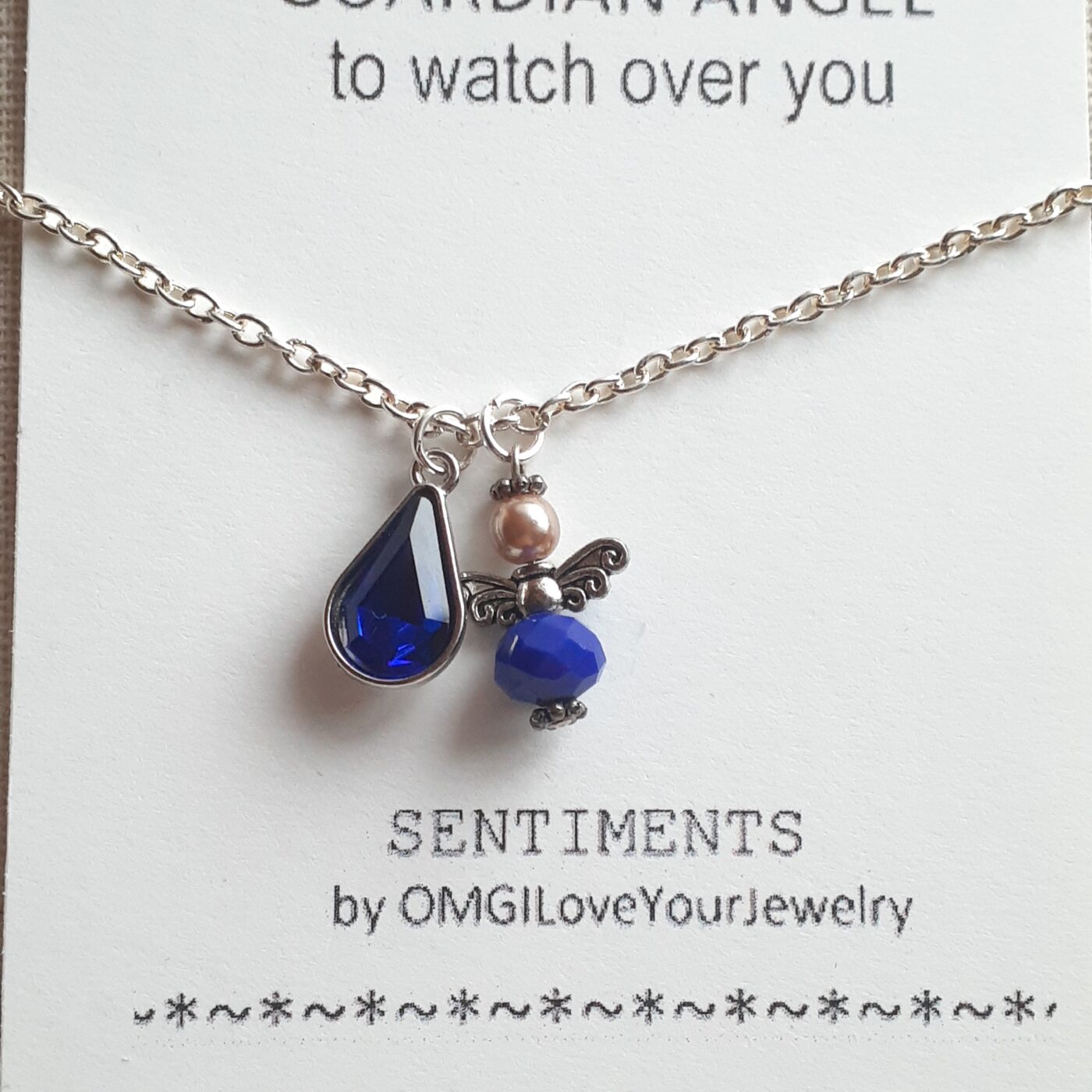 Sentiments Collection ~ Sterling silver Guardian Angel Necklace with a sapphire blue charm and angel handmade by me with pearl and Czech crystals. A guardian angel to watch over you. The sterling silver necklace measures 18.5 inches long but I can make it to suit. Please contact me.