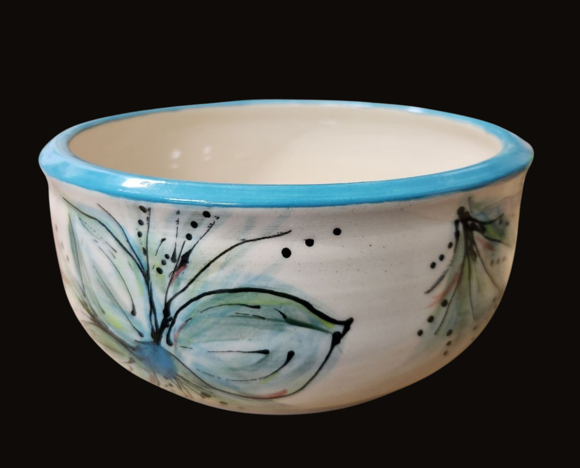 Made of stoneware clay, hand painted and finished in a durable , clear glaze. Dishwasher, microwave and oven safe.