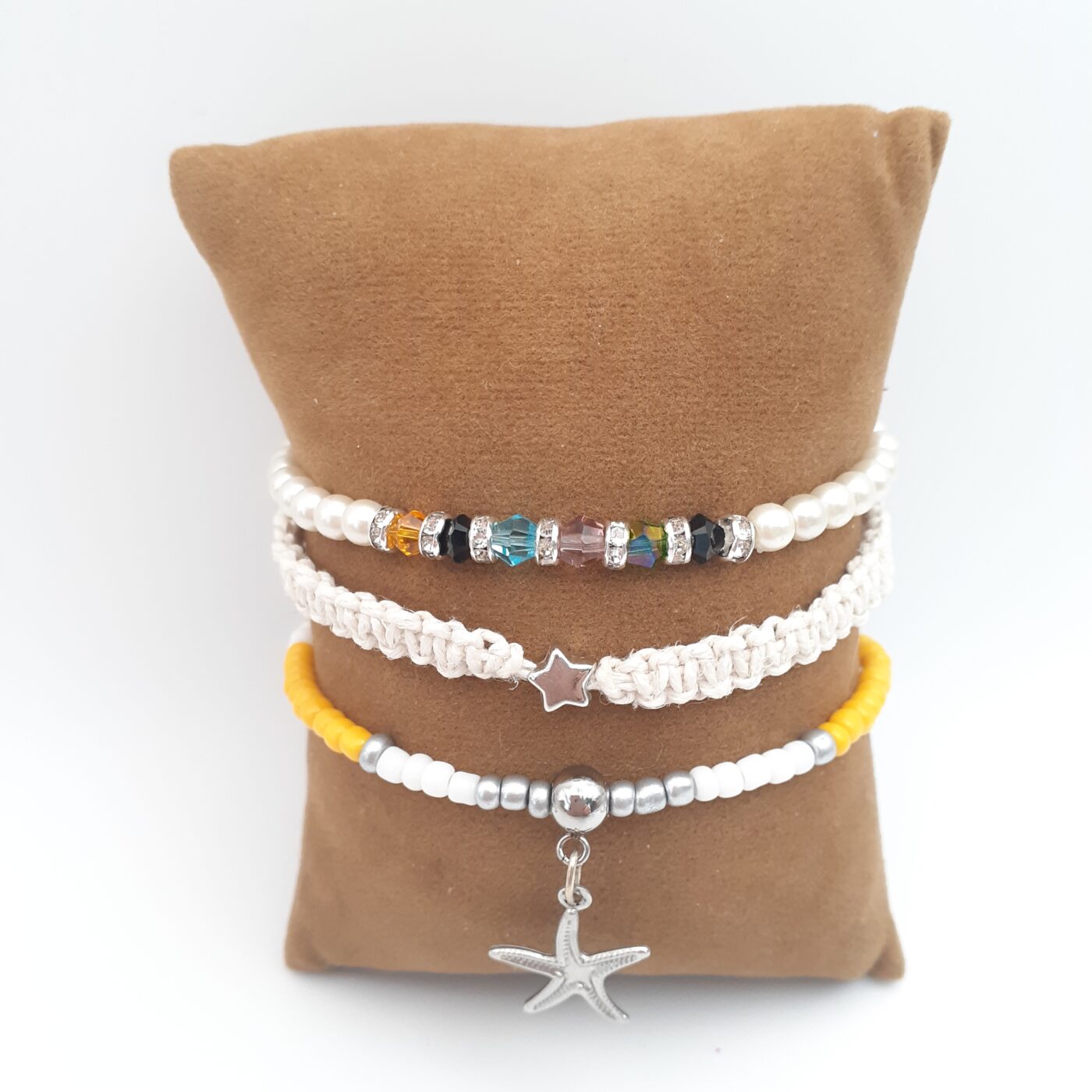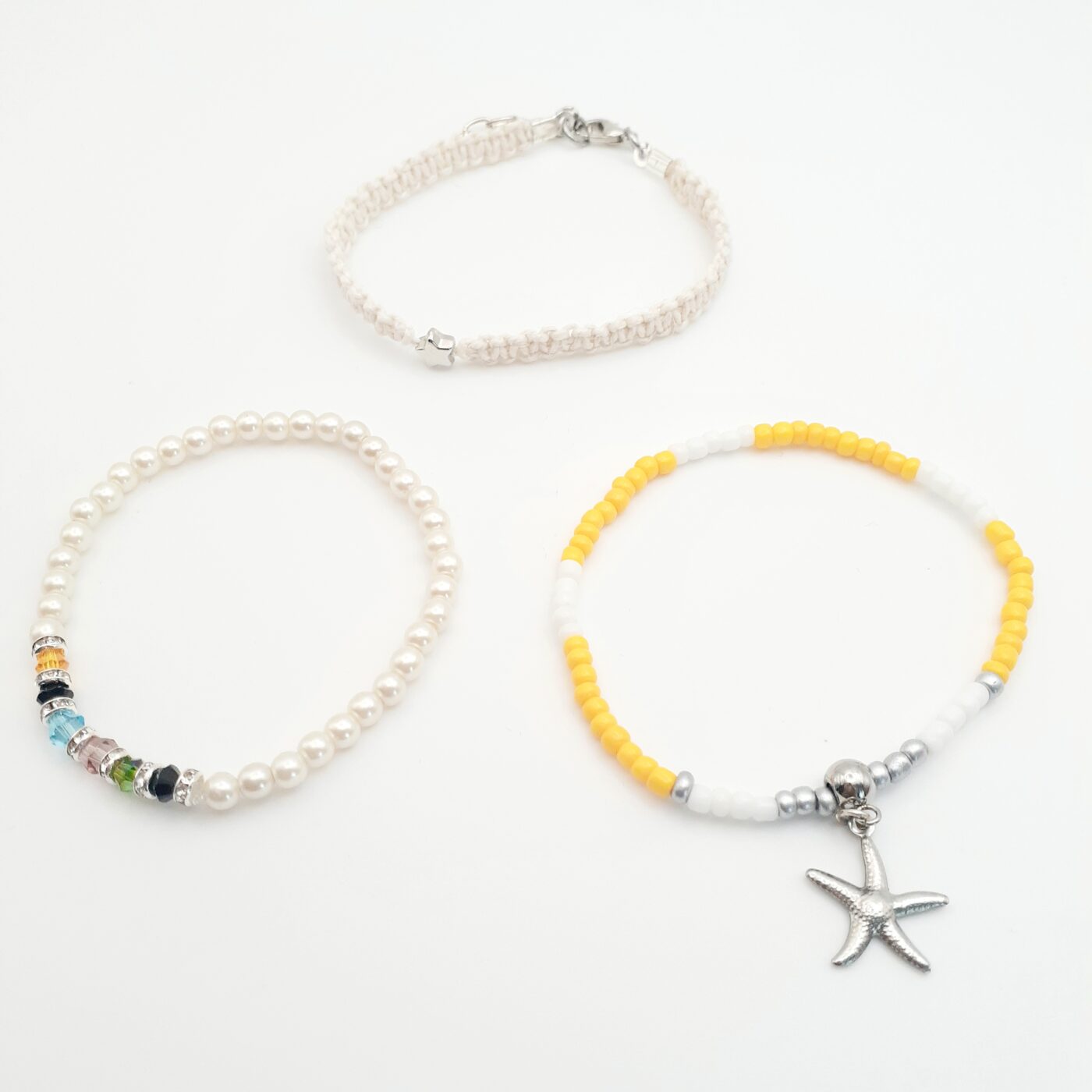 3 thin bracelets stacked for a summery look. Bright yellow, pure white and bright shiny silver components, as well as white pearls and swarovski crystals for extra sparkle. The yellow and white beaded bracelet with the 3D starfish charm is an easy on stretch bracelet. The white pearls and swarovski crystals bracelet is also a stretch-style bracelet. The thin hemp cord bracelet with the tiny polished silver 3D star charm closes with a lobster clasp. All fit a 6.5 inch wrist.