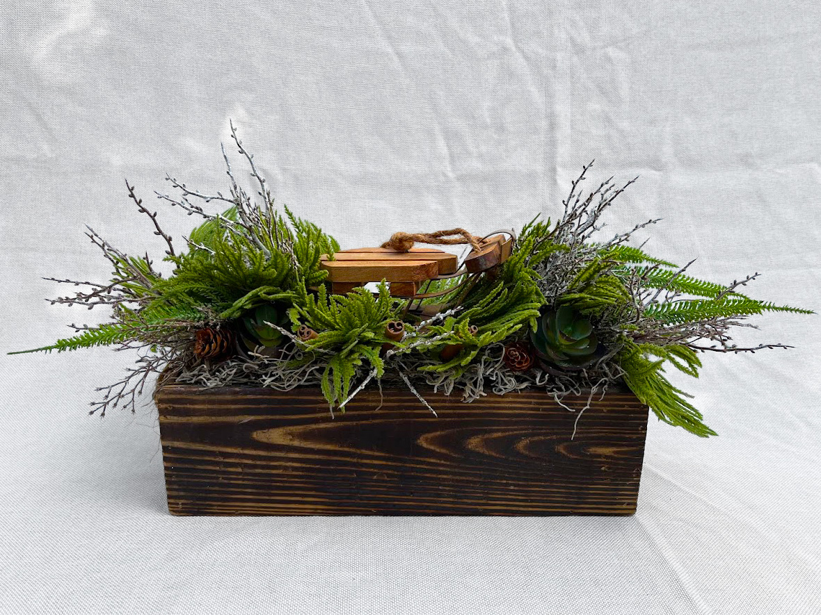 This wintery centrepiece features a cute wooden sleigh resting on faux greenery, with glistening twigs, pine cones and few touches of cinnamon. Arranged in a locally handmade wood box, this is a perfect décor piece for the whole winter season.