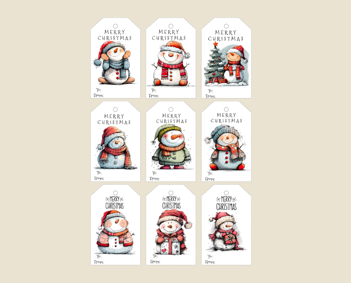 Pack of 24 whimsical snowman Christmas gift tags, perfect for adding a playful and festive touch to your holiday presents. Printed on quality card stock with charming seasonal designs.