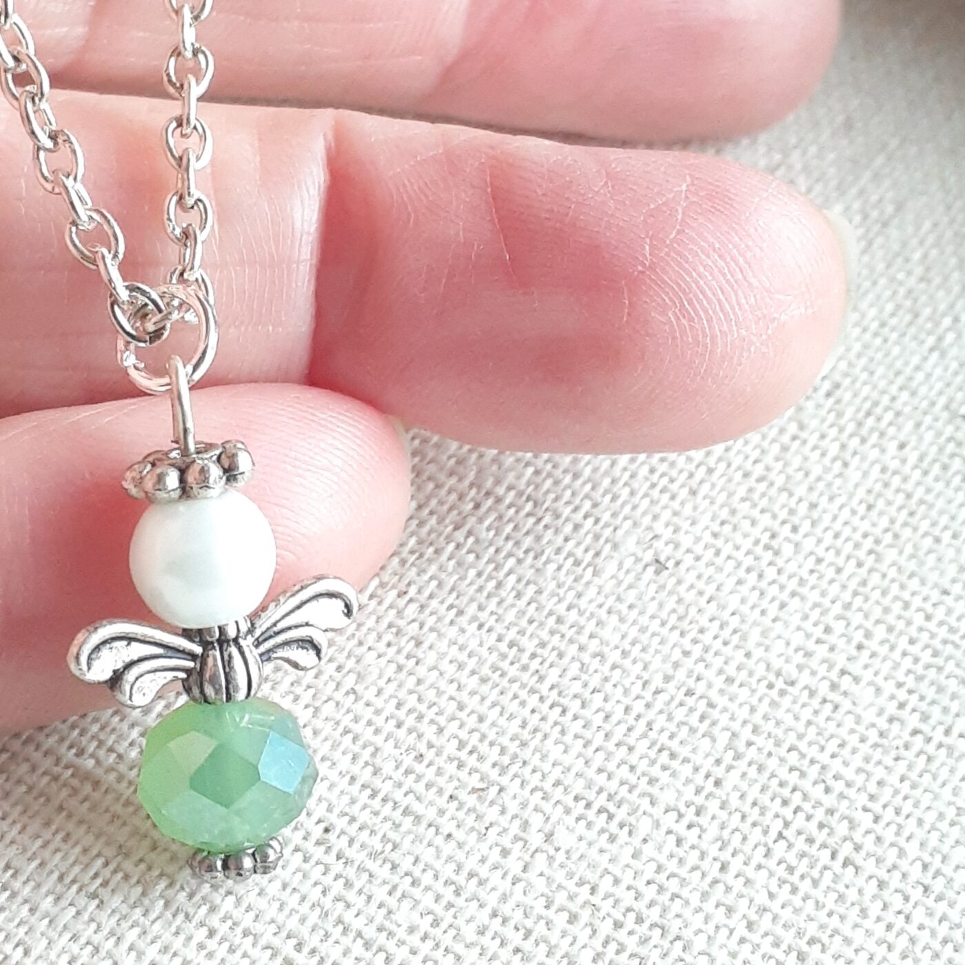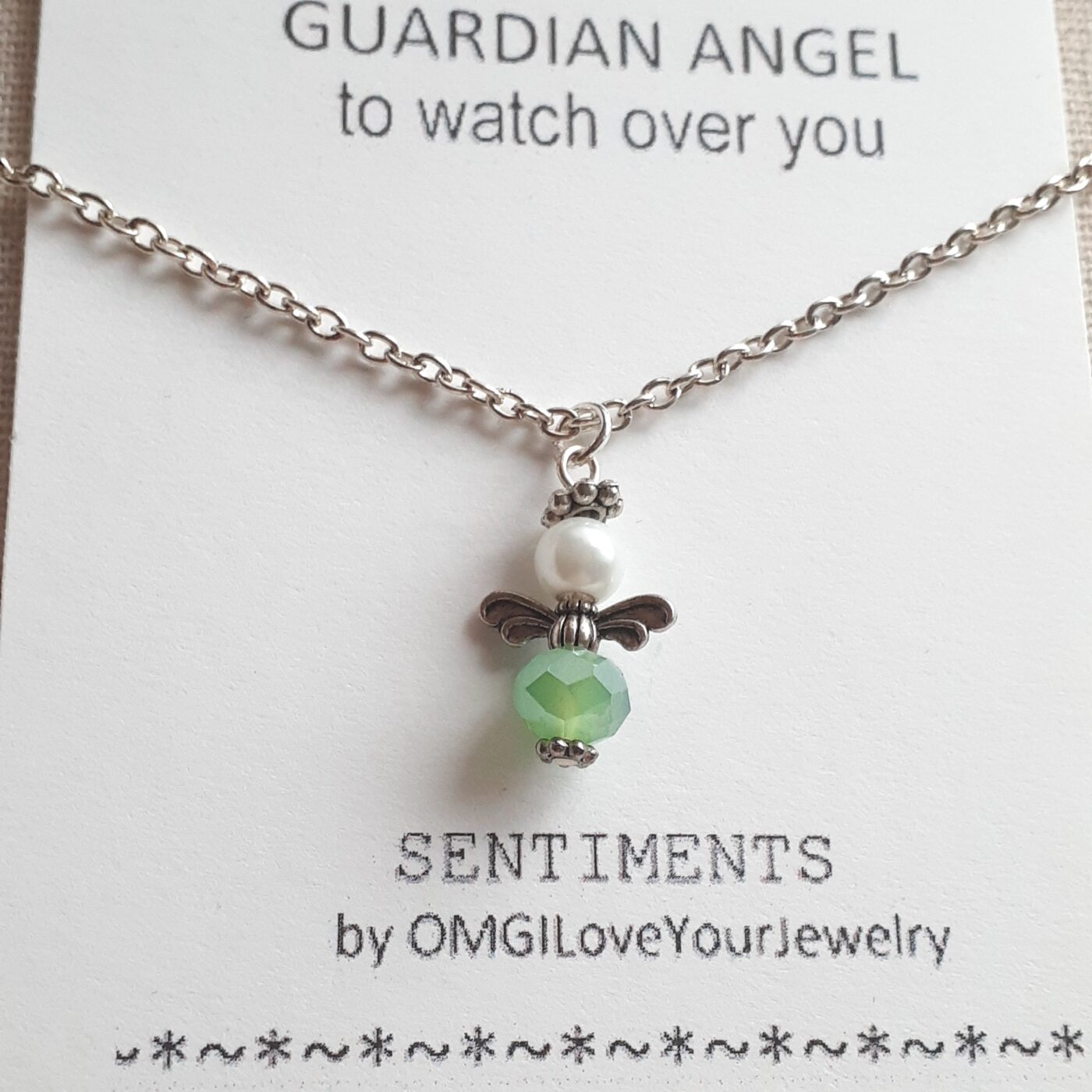 Sentiments Collection ~ Sterling silver Guardian Angel Necklace with an angel handmade by me with pearl and soft moss green Czech crystals. A guardian angel to watch over you. The sterling silver necklace measures 18.5 inches long but I can make it to suit. Please contact me.