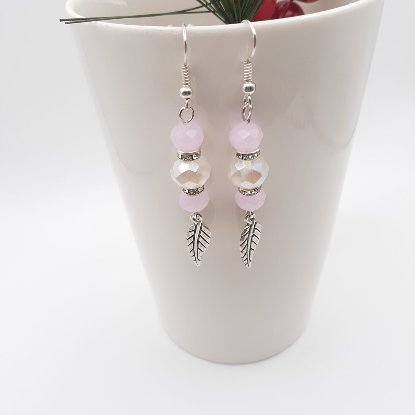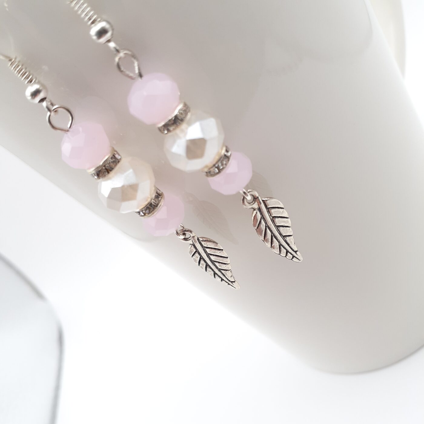 A very soft pink hue is found in these pink quartz faceted crystal earrings. The larger white faceted crystals set perfectly together with the rhinestone jeweled spacer, and bring together a pleasing look on these gorgeous one of a kind dangle earrings.