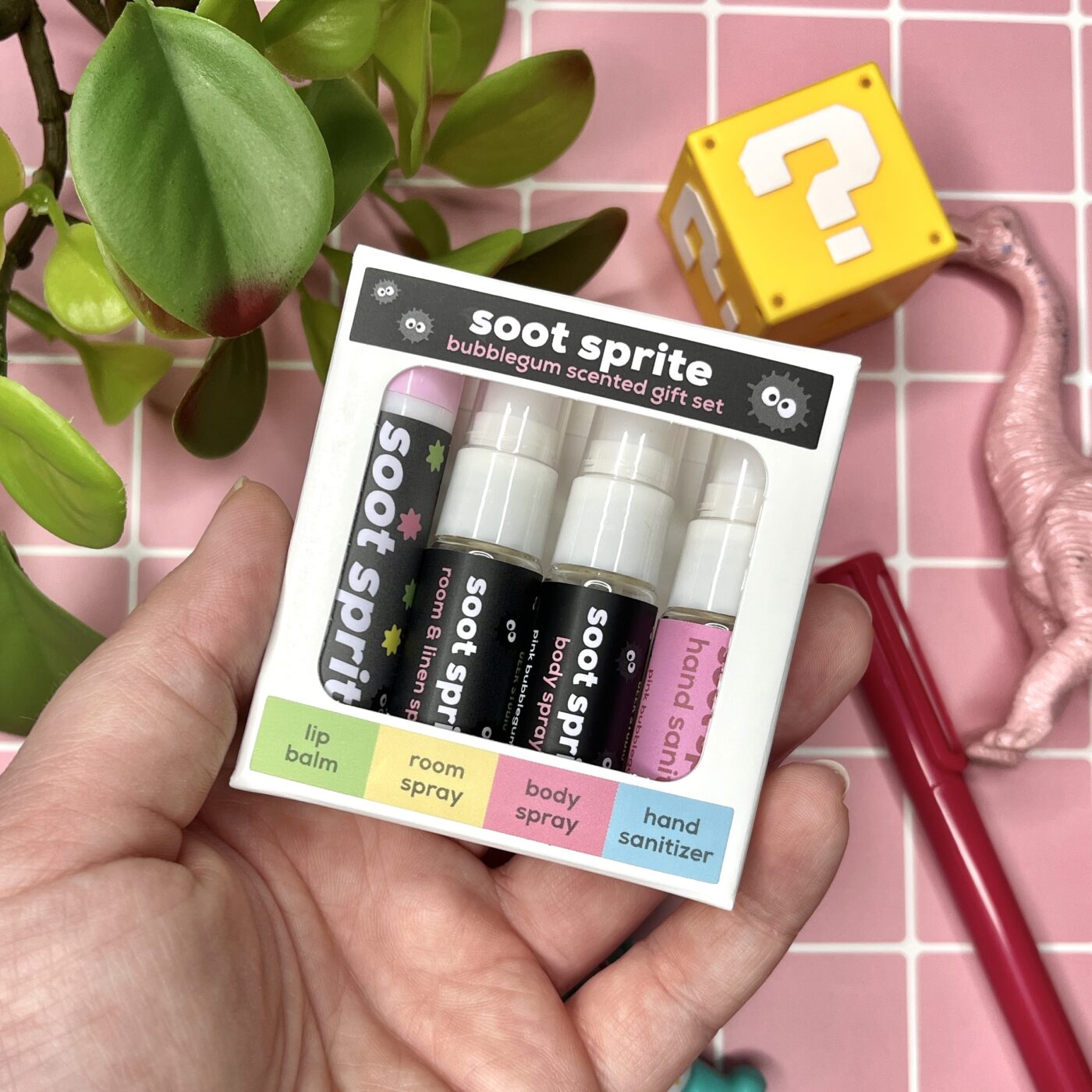The perfect little set to try a variety of products. Each set comes with 4 products all in the same scent. A full sized lip balm along with mini sprays of body spray, room spray and hand sanitizer spray.