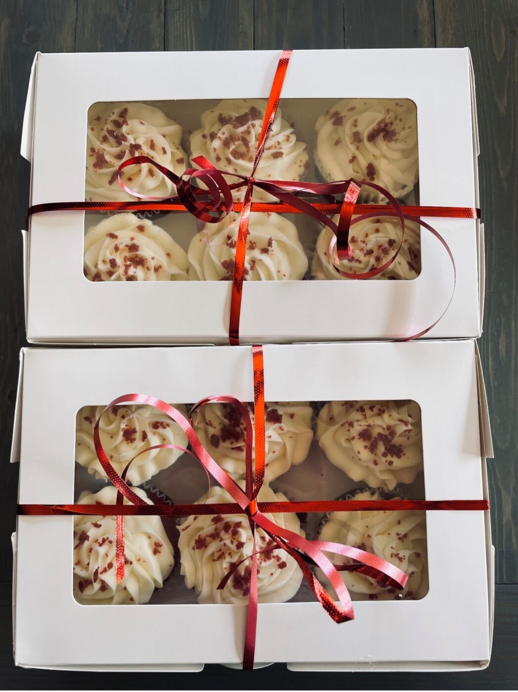 - 12 RED VELVET – topped and stuffed with tangy cream cheese icing