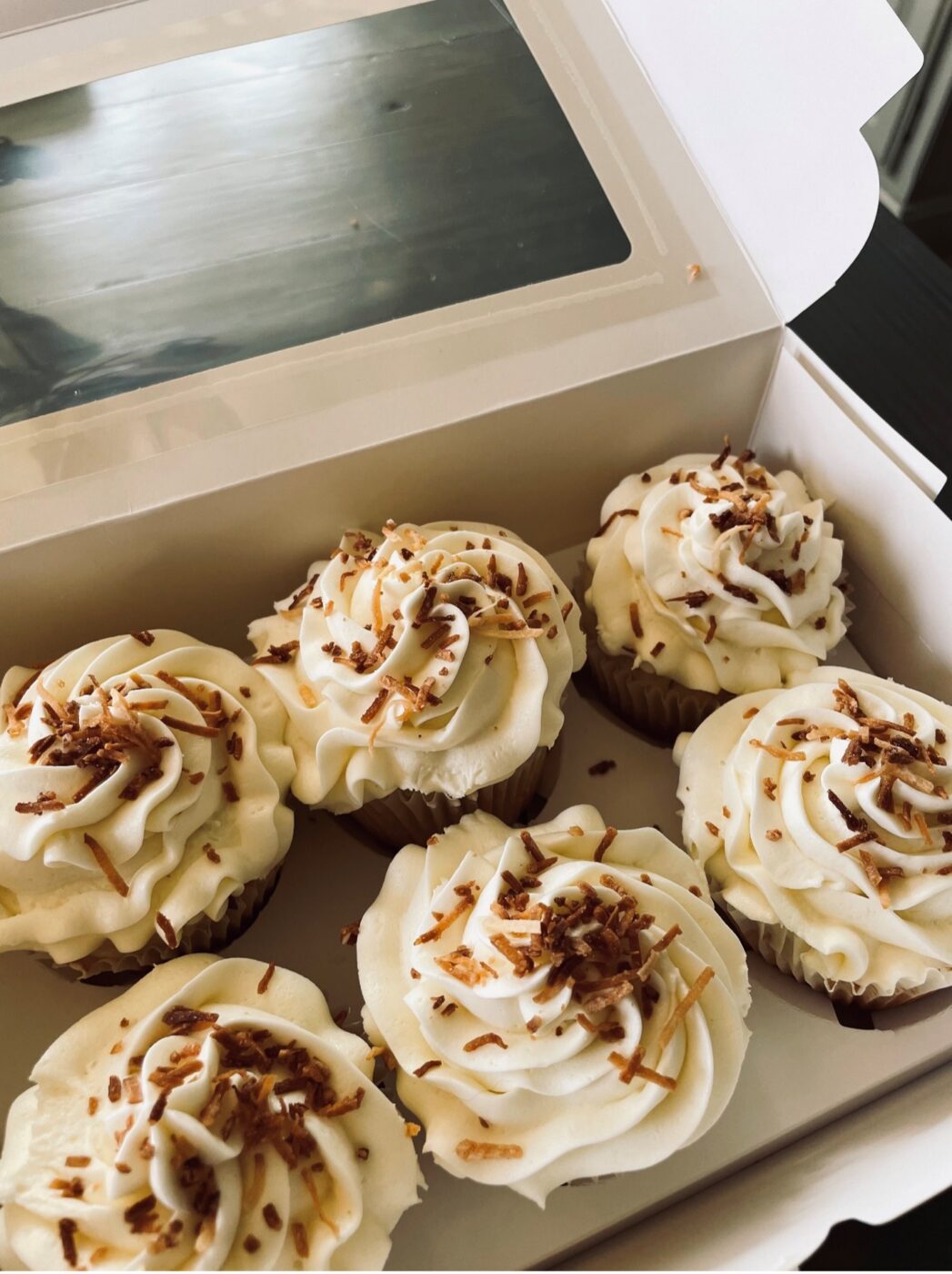 - 12 COCONUT – topped with coconut cream cheese icing and coconut flakes
