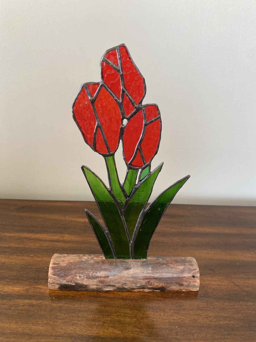 Stained Glass Tulip Bunch on Driftwood Base – Red