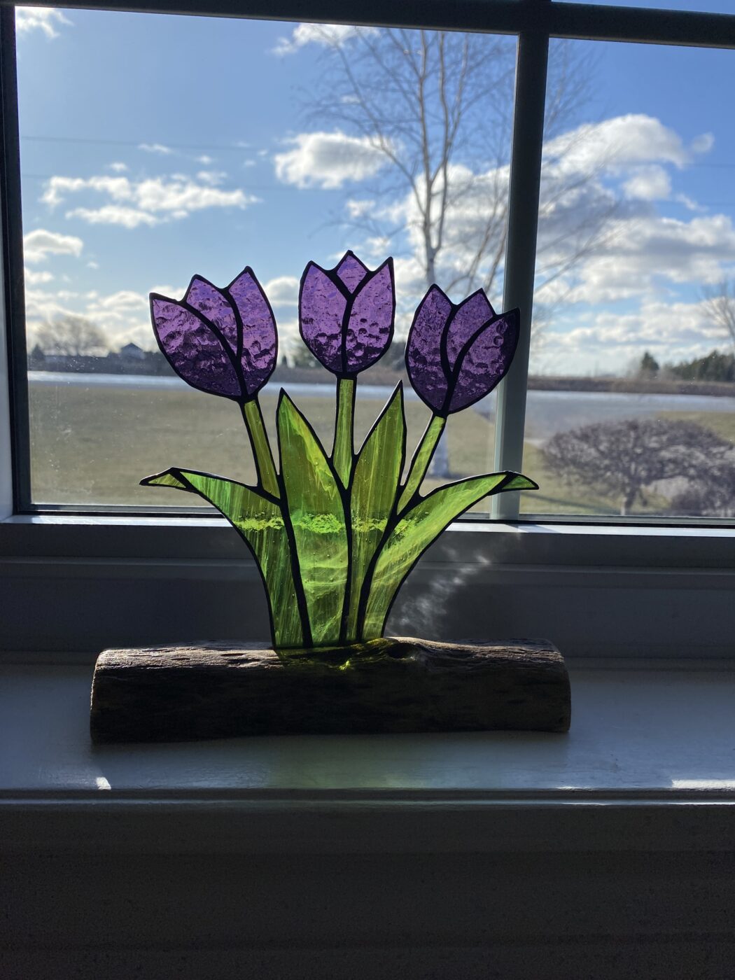 Stained Glass Tulip Flower Bouquet inlaid on driftwood base – Purple