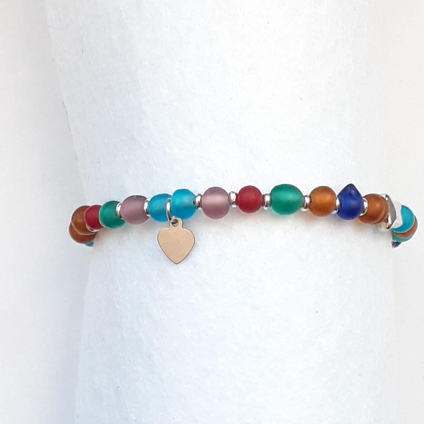A thin colourful frosted beaded bracelet. Adjustable from 6 to 7 inches. A cute bracelet accented with a tiny heart charm and 2 tiny silver stars. Beautiful, easy wear and a versatile accessory. This lightweight piece featuring mixed colours is ideal for layering. Great for Valentine’s Day gifts.