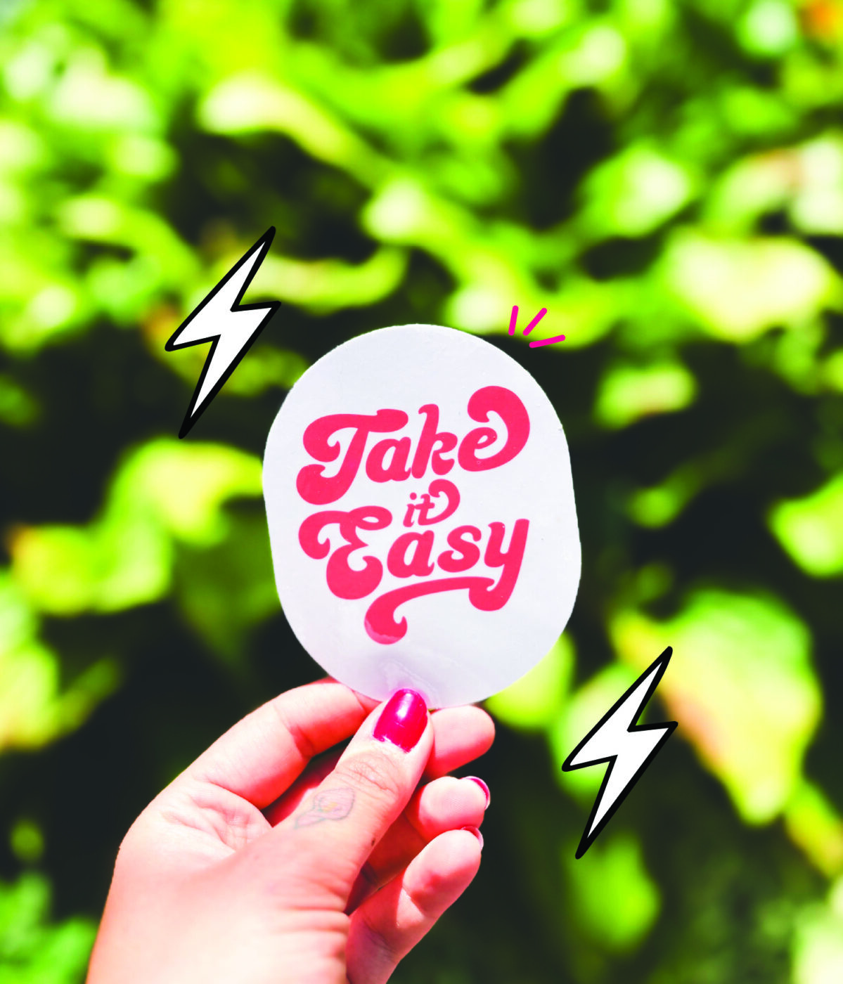 Bring laid-back vibes wherever you go with this Take It Easy sticker! Designed in a bold retro 70s-inspired font, this decal is perfect for adding a groovy touch to your laptop, water bottle, journal, car bumper, or any smooth surface.