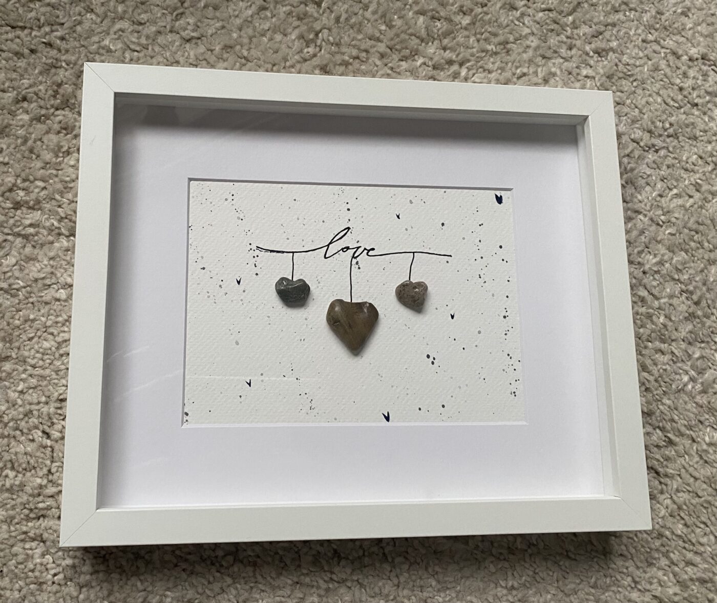 This beautiful piece is made from heart-shaped rocks from Lake Erie and has a splash of watercolour for an added touch. Such a simple but dynamic piece to show that special someone how much they are loved.