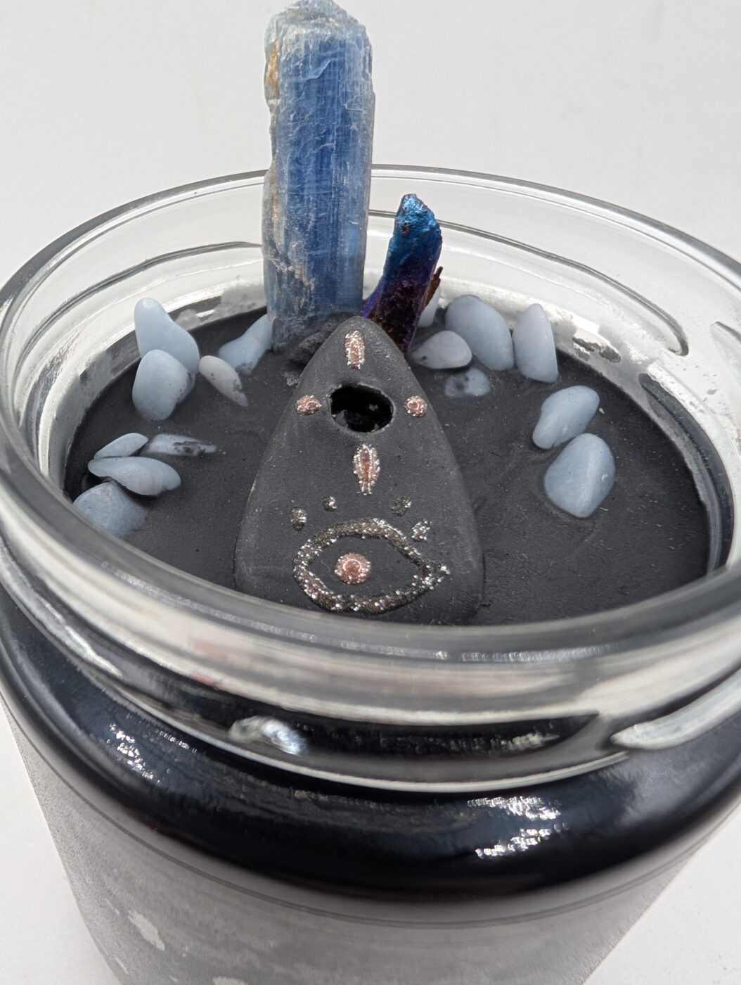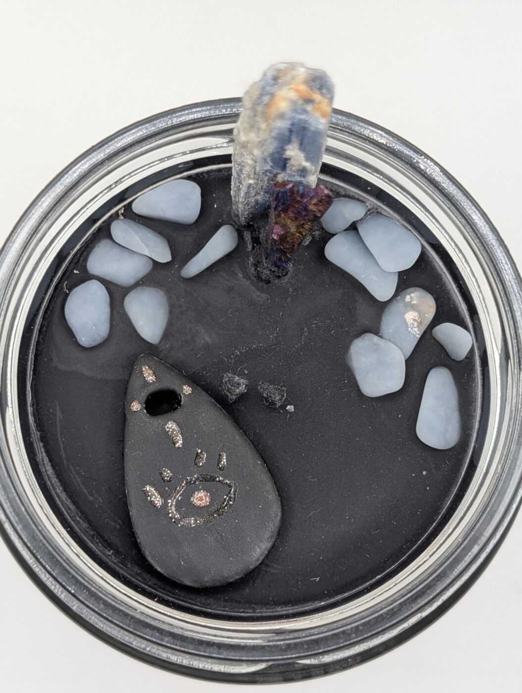 Topped with Blue and Aura Black Kyanite and Angelite chips, this blend is designed to help you connect with your ancestral and spiritual guides while offering a spiritual boost and protection against negativity.