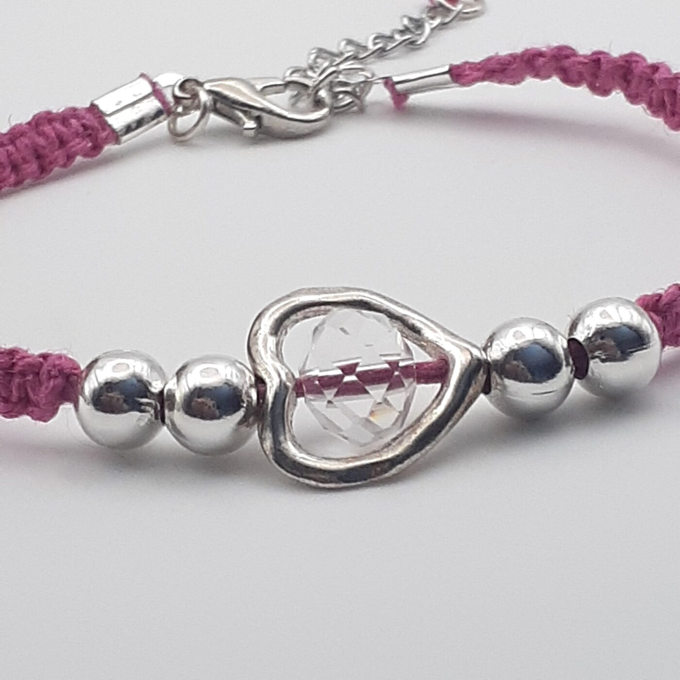 Thin Pink Hemp Macrame Bracelet with Open Heart-Shaped Metal Charm with Clear Faceted Crystal